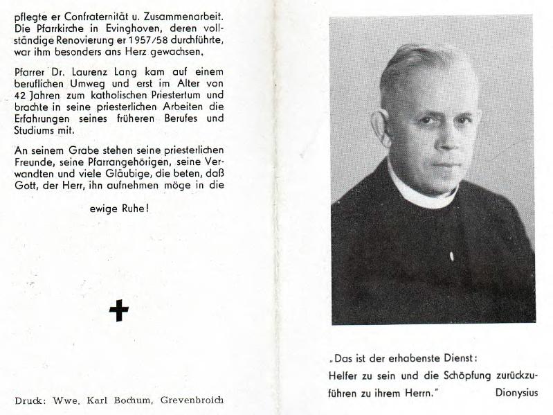 Totenzettel von Dr. rer. pol. Laurenz Lang, Pfarrer in Evinghoven |