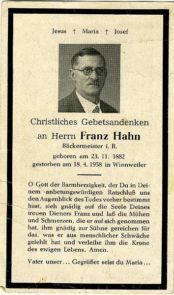 aktuell21:24, 29. Mai 2009Vorschaubild der Version vom 21:24, 29. Mai 2009500 × 847 (69 KB)Peterga (Diskussion • Beiträge)== Beschreibung == {{Information |Beschreibung = Totenzettel Franz Hahn |Quelle = selbst erstellt |Urheber = Peter Gaßner |Datum = Repro am 29.05.2008 |Genehmigung = |Andere Versionen = |Anmerkungen = }} == Licensing ==