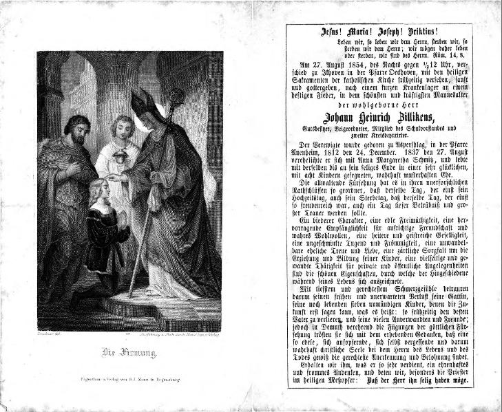 Totenzettel des Gutsbesitzers, Mitglied des Schulvorstandes und zweiten Kreisdeputierten Johann Heinrich Zillikens aus Evinghoven | |||