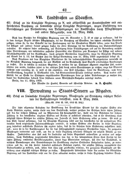 Ministerial-Blatt für die gesammte innere Verwaltung in den Königlich Preußischen Staaten, 16. Jahrgang; Berlin: Verlag des Königlichen Zeitungs-Komtoirs, 1855; S. 62-63. | |||