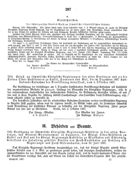 Ministerial-Blatt für die gesammte innere Verwaltung in den Königlich Preußischen Staaten, 28. Jahrgang; Berlin: Verlag des Königlichen Zeitungs-Komtoirs, 1867; S. 297. | |||