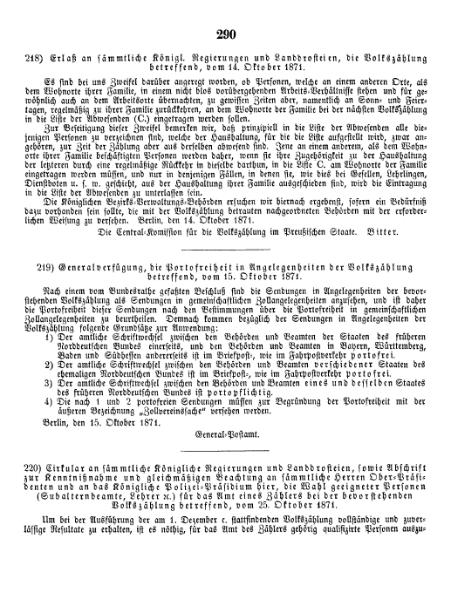 Ministerial-Blatt für die gesammte innere Verwaltung in den Königlich Preußischen Staaten, 32. Jahrgang; Berlin: Verlag des Kaiserlichen Post-Zeitungs-Amts, 1871; S. 289-291. | |||