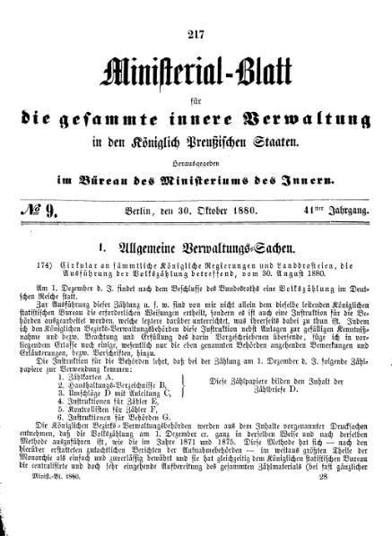 Ministerial-Blatt für die gesammte innere Verwaltung in den Königlich Preußischen Staaten, 41. Jahrgang; Berlin: Verlag des Kaiserlichen Post-Zeitungsamts, 1880; S. 217-228. | |||