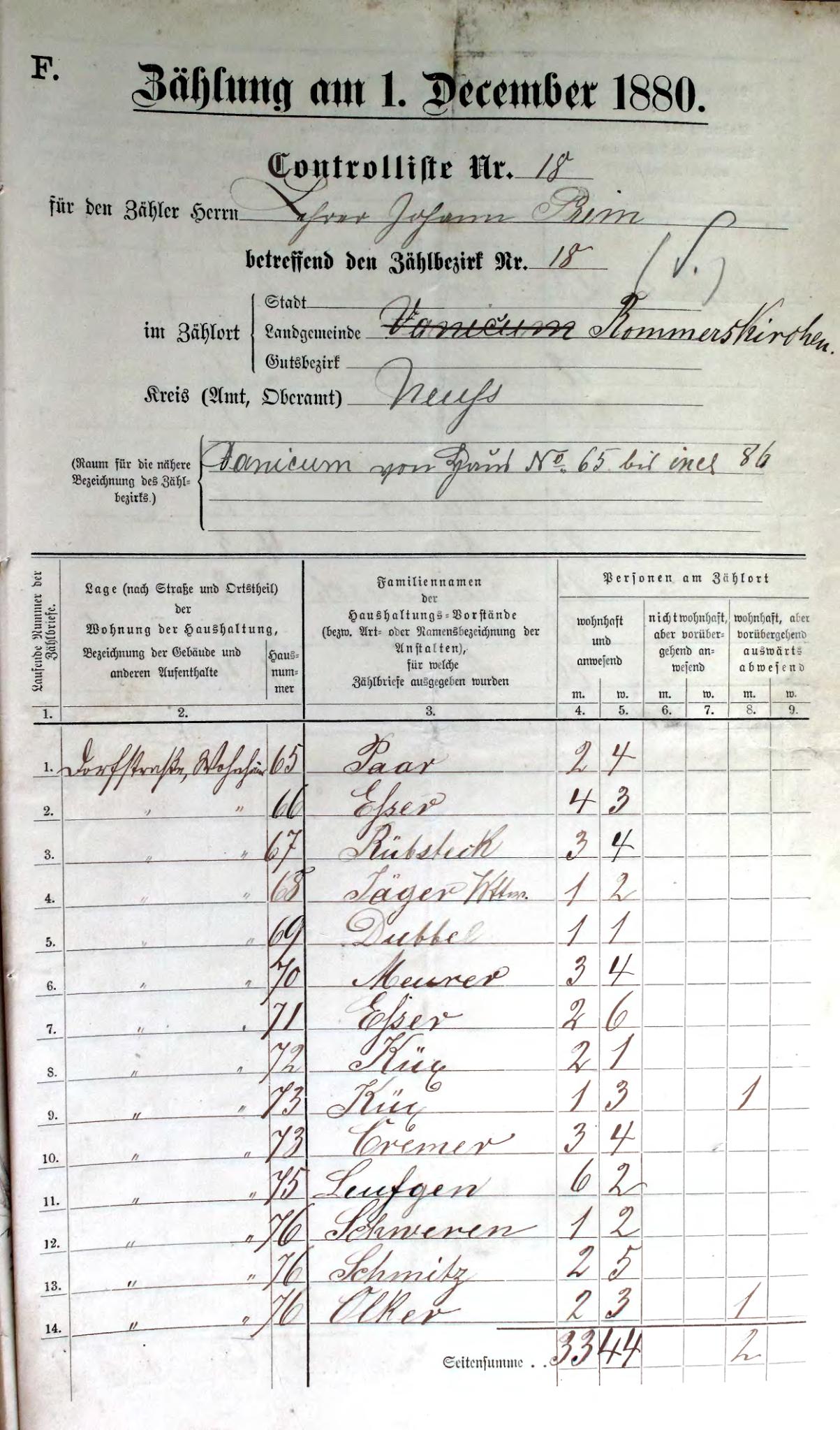 Controllisten der preußischen Volkszählung vom 1.Dezember 1880 für Vanikum
