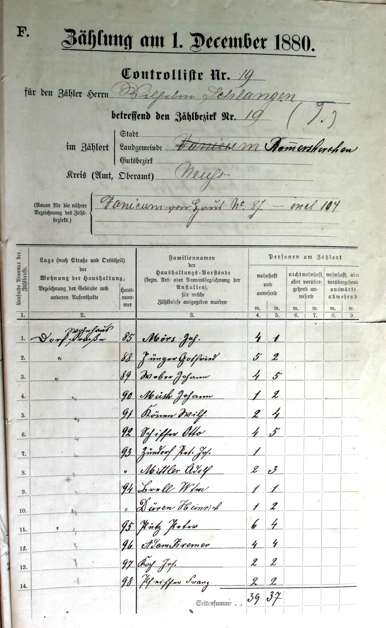 Controllisten der preußischen Volkszählung vom 1.Dezember 1880 für Vanikum