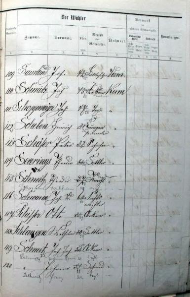 | aktuell | 15:33, 22. Jul. 2010 | 3.066 × 4.830, 13 Seiten (1,31 MB) | KlausErdmann (Diskussion • Beiträge) | {{Information |Beschreibung = Wählerliste der Gemeinde Rommerkirchen, <br />hier: Vanikum |Quelle = Gemeindearchiv Rommerskirchen |Urheber = |Datum = Dezember 1873 |Scans = Klaus Erdmann ''(Scan & Repro 22.07.2010)'' |Genehmigung |