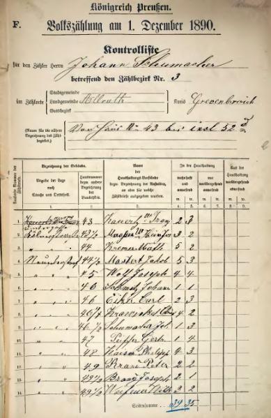 Kontrolliste zur Volkszählung vom 1. Dezember 1890 im Königreich Preußen | |