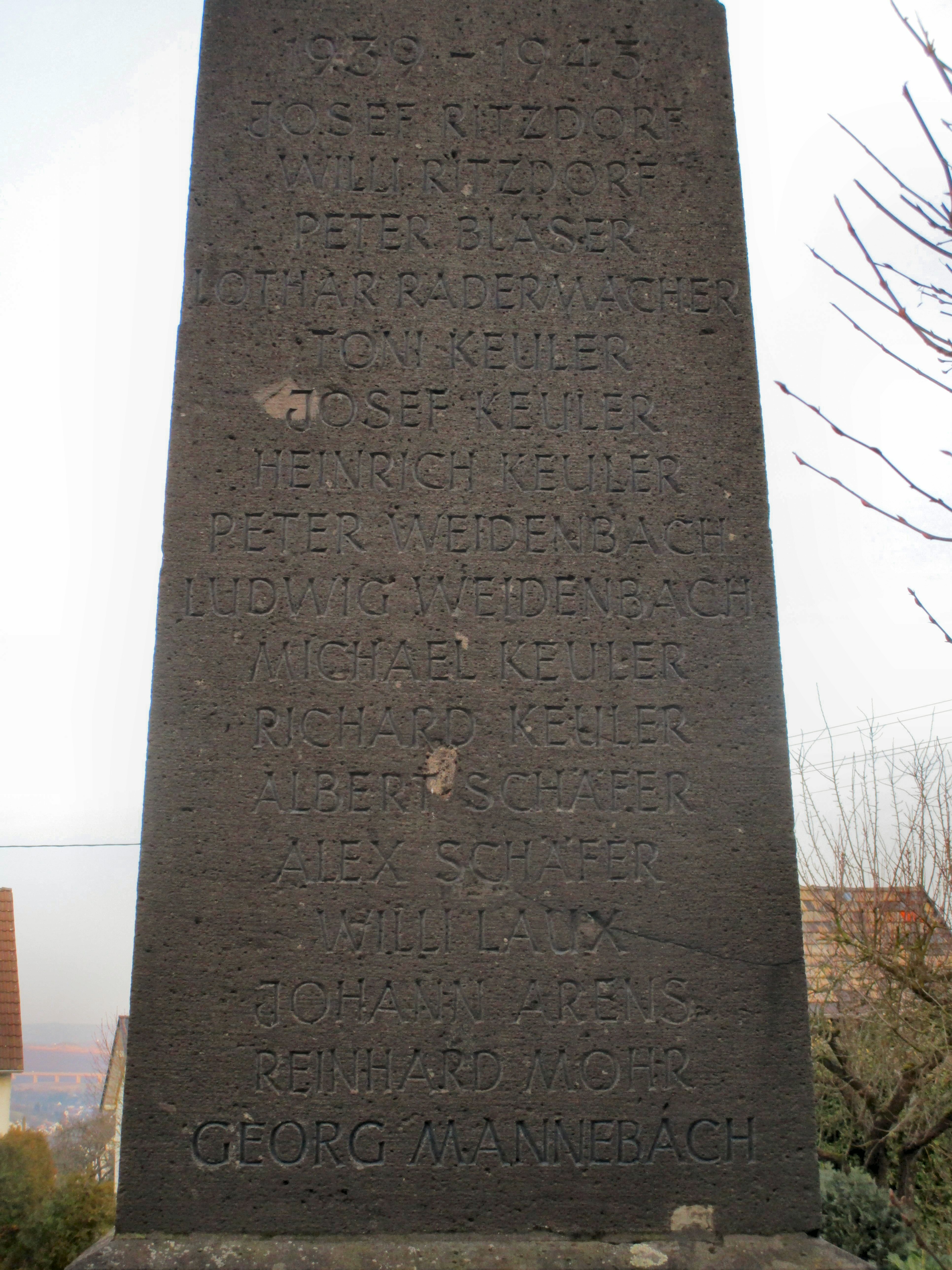 | aktuell | 19:05, 18. Feb. 2018 | 3.864 × 5.152 (2,38 MB) | Wilkinus (Diskussion • Beiträge) | {{Information |Beschreibung = Niederdürenbach-Hain: Rückseite am Kriegerdenkmal 1914-18 |Quelle = eigenes Foto |Urheber = Peter Wittgens |Datum = 17.02.2018 |Scans = |Genehmigung = |Andere_Versionen = |Anmerkungen = }} [[Category:Images {{subst:R |
