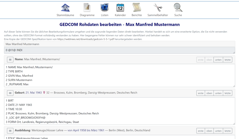 webtrees: Bearbeiten der GEDCOM-Rohdaten |