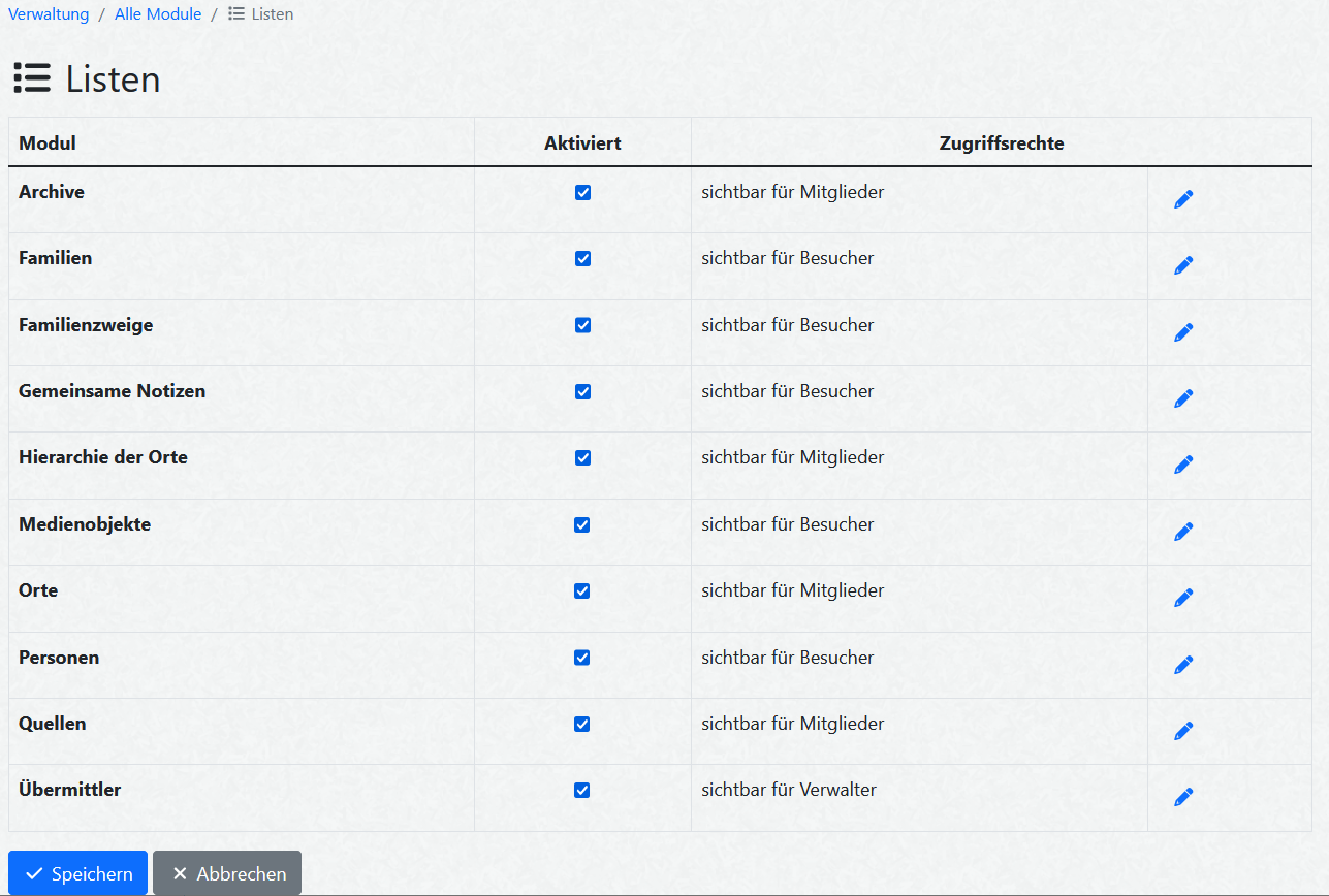 webtrees: Verwaltung - Module - Genealogie - Listen |