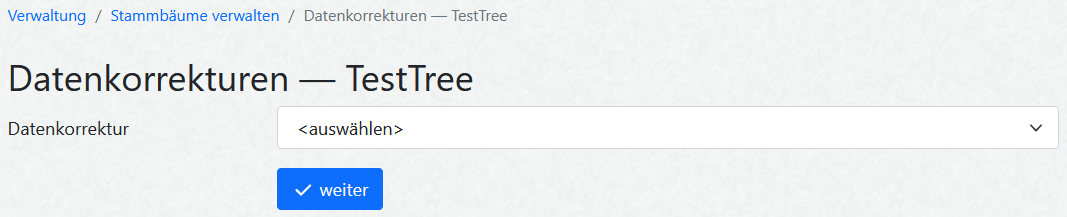 webtrees: Verwaltung-Stammbäume Datenkorrekturen Auswahl |