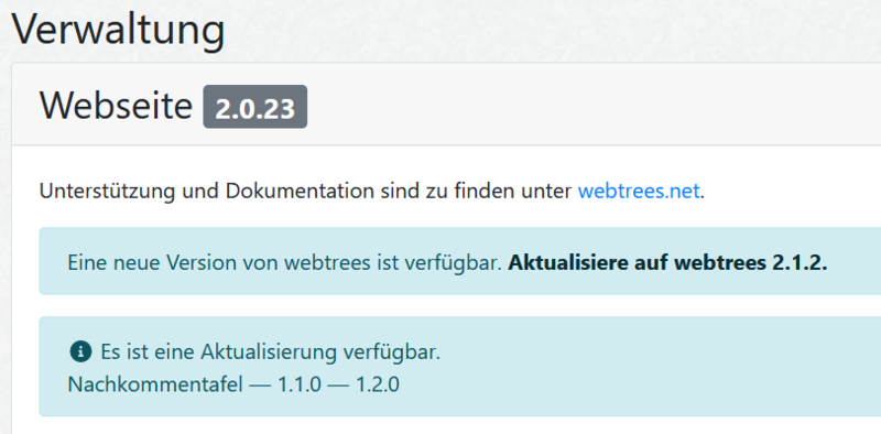 webtrees: Verwaltung - Webseite "Neue Versionen" |