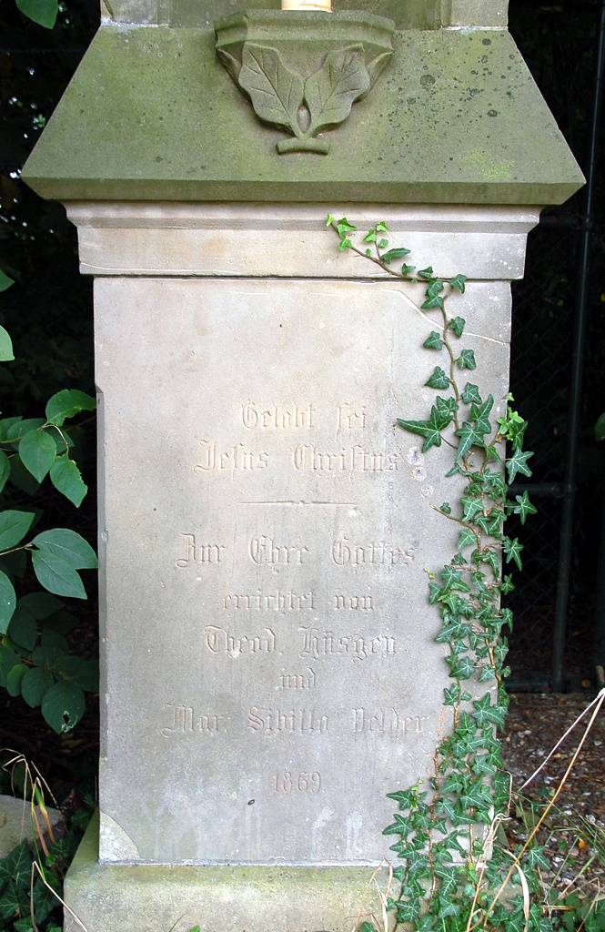 Die Inschrift des Wegekreuzes bei Haus Leusch in Rommerskirchen-Ramrath