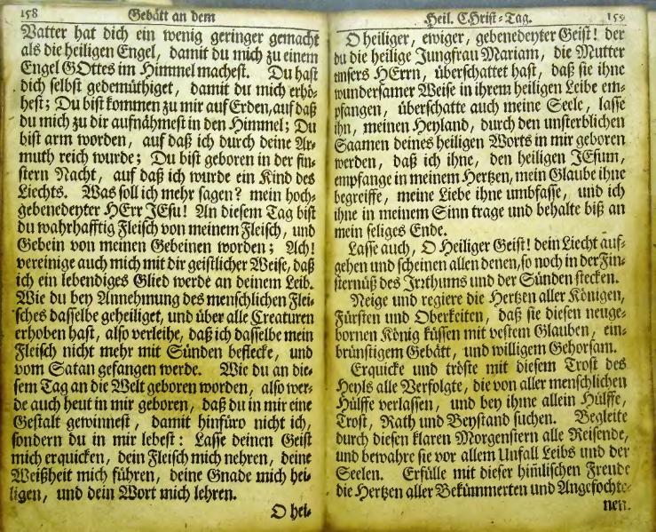 Neu eröffneter himmlischer Weyhrauch-Schatz oder vollständiges Gebätt-Buch. Auf allerhand Zeiten, Anliegen und Personen gerichtet; dabey ein genugsamer Unterricht vom Gebrauch des Heil. Abendmahls, Besuchungen der Krancken, und Zubereitung der zum Tode verurtheilten Personen, etc. samt behörigen Gebätten: Auß den aller-berühmtesten Englisch- und Französischen Theologis übersetzt und zusammen gezogen durch Johannem Zollikoffern, weiland Cammerern und Pfarrern der Christlichen Gemeinde zu Herisau. | |||