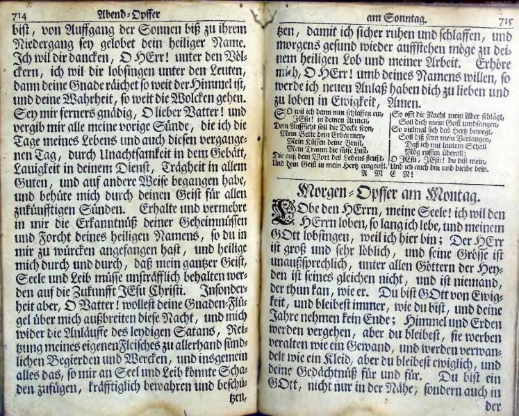 Neu eröffneter himmlischer Weyhrauch-Schatz oder vollständiges Gebätt-Buch. Auf allerhand Zeiten, Anliegen und Personen gerichtet; dabey ein genugsamer Unterricht vom Gebrauch des Heil. Abendmahls, Besuchungen der Krancken, und Zubereitung der zum Tode verurtheilten Personen, etc. samt behörigen Gebätten: Auß den aller-berühmtesten Englisch- und Französischen Theologis übersetzt und zusammen gezogen durch Johannem Zollikoffern, weiland Cammerern und Pfarrern der Christlichen Gemeinde zu Herisau. | |||