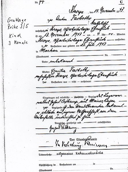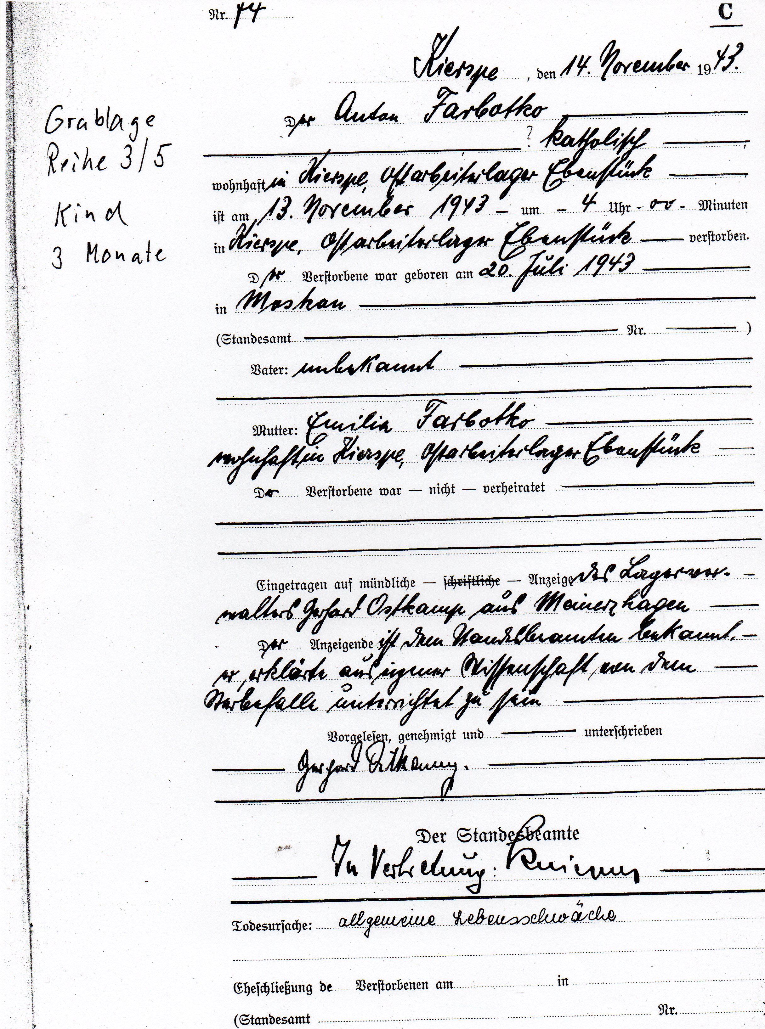 Sterbeurkunde Anton Farbotko *20.7.1943 + 13.11.1943 |