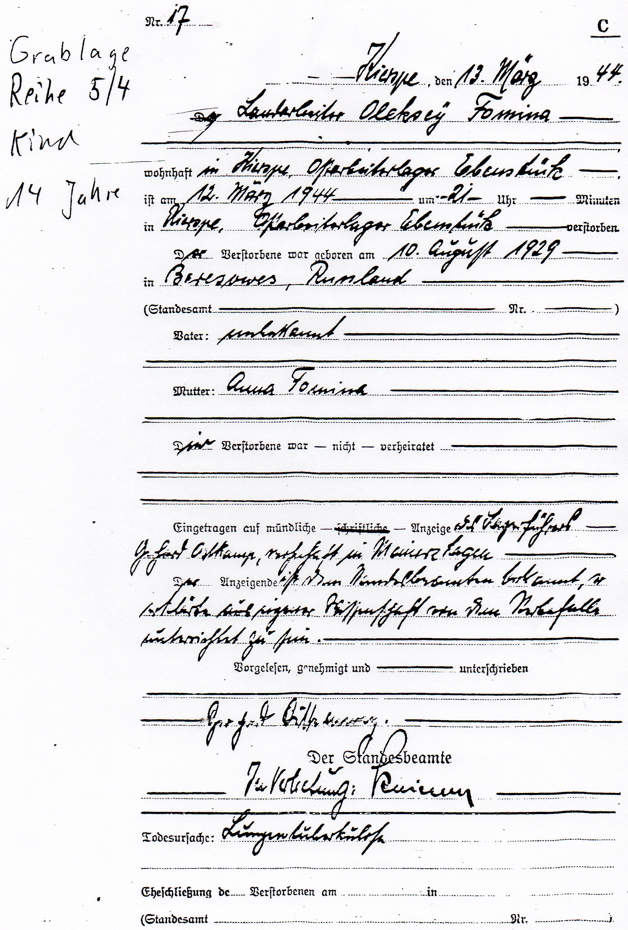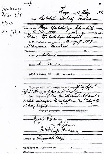 Sterbeurkunde Oleksey Fomina *10.8.1929 + 12.3.1944 |