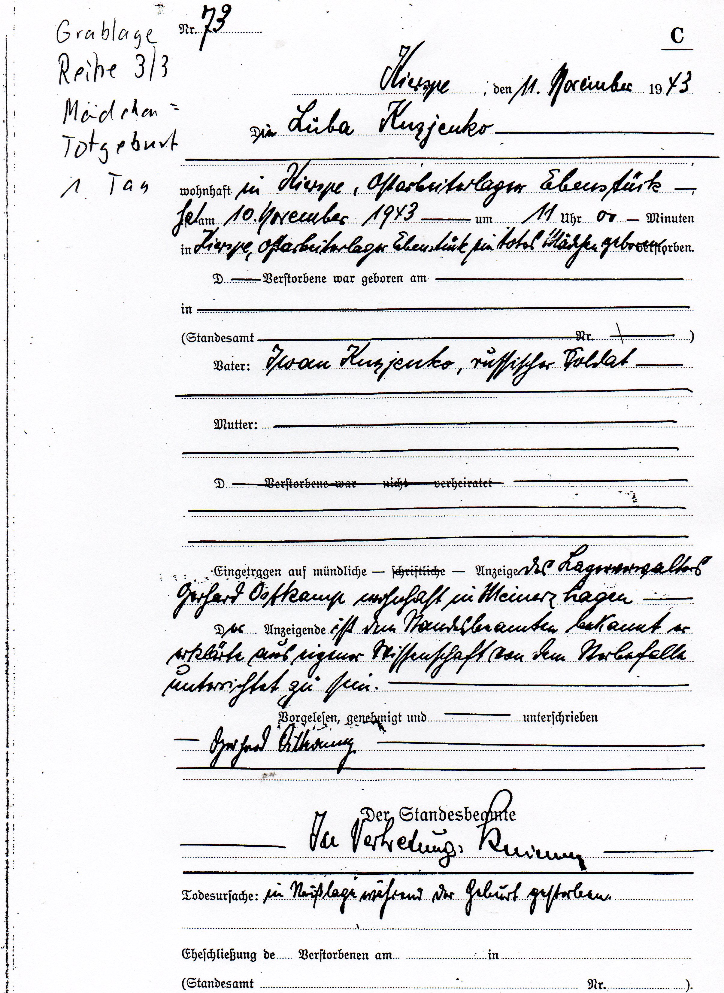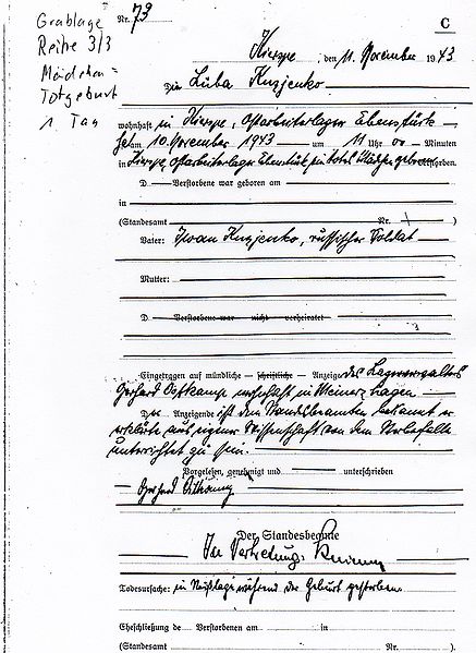 Sterbeurkunde der Tochter von Luba Kuzjenko *10.11.1943 +10.11.1943 |