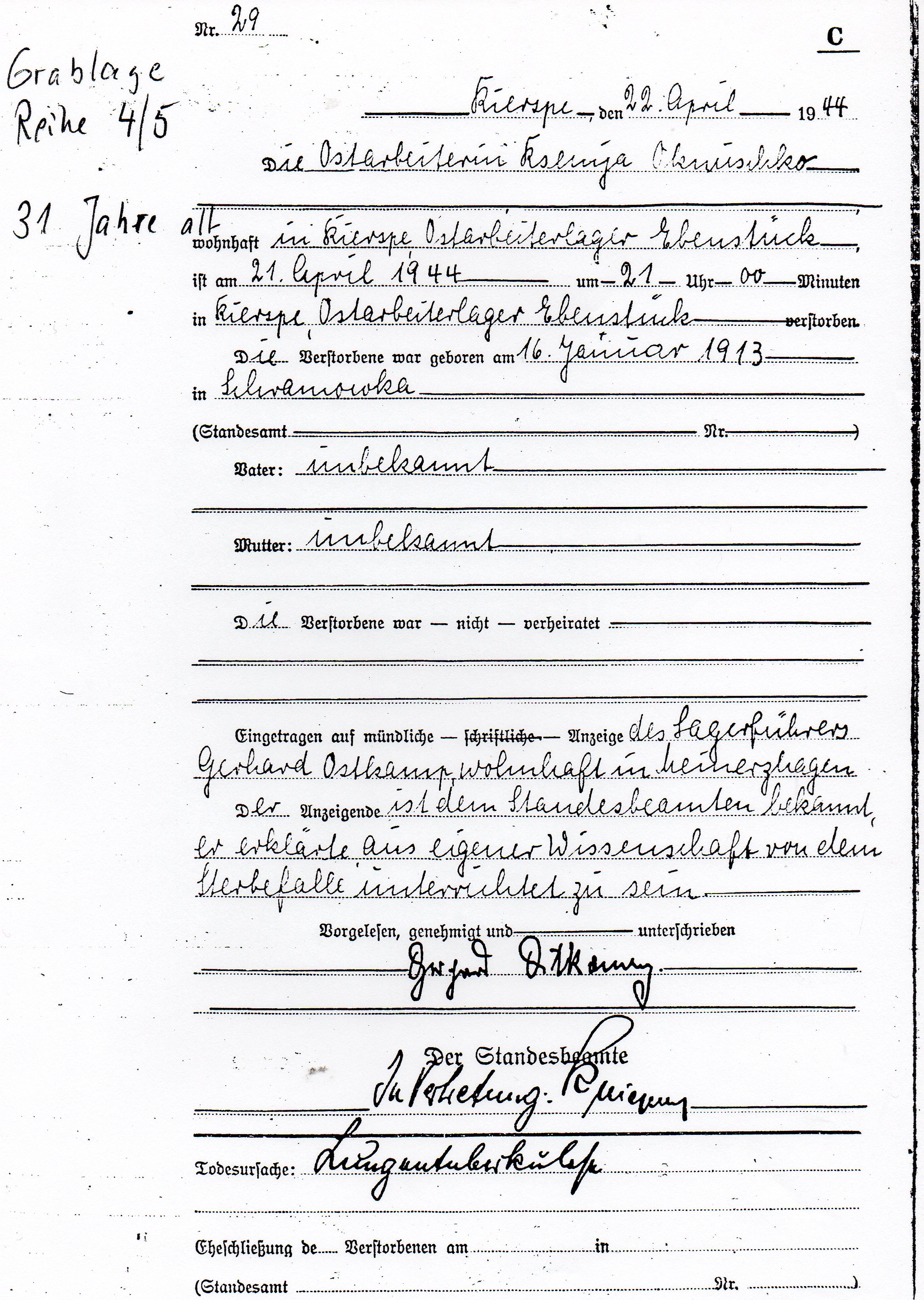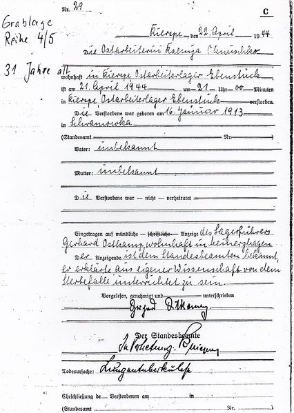 Sterbeurkunde Ksenija Oknuschko *16.2.1913 + 21.4.1944 |