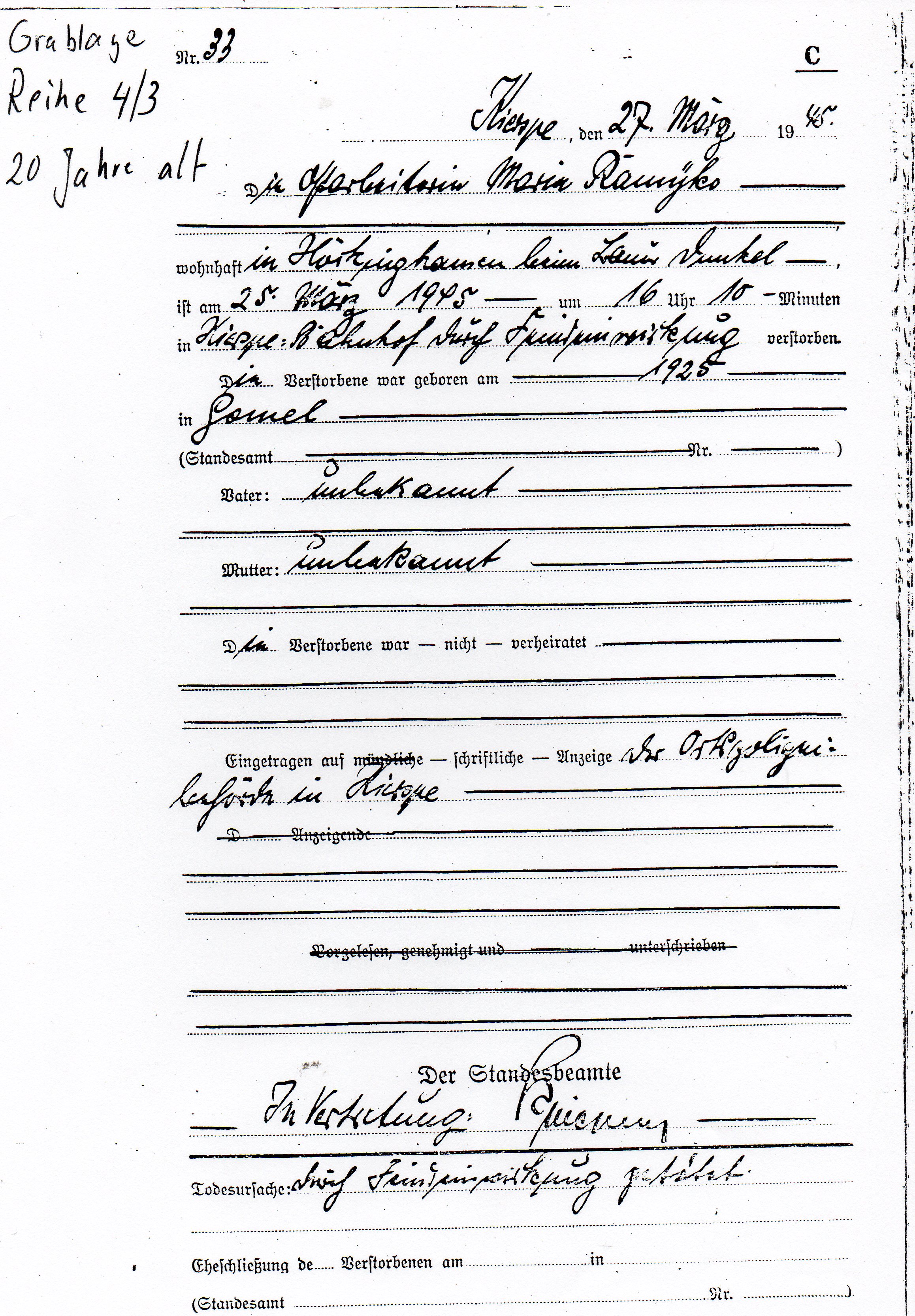 Sterbeurkunde Maria Ramyko *1925 + 25.3.1945 |