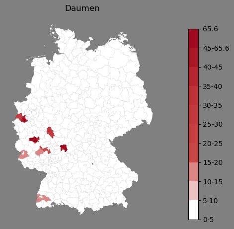 Relative Verteilung des Namens Daumen (1996)Direkt zur Karte Die Farbskala zeigt die Anzahl von "Daumen" bezogen auf je 1 Million Einträge. |