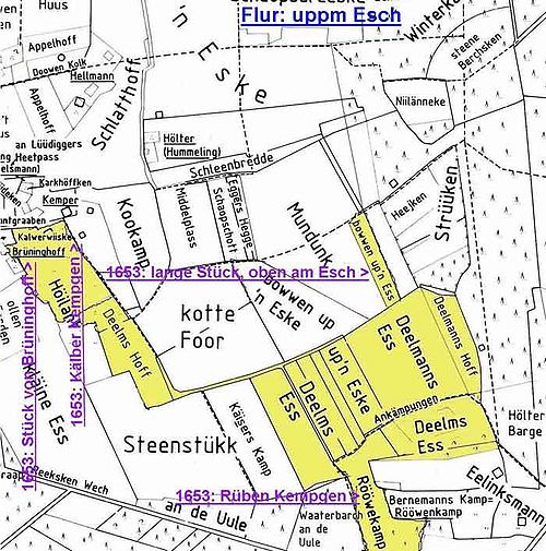 Ungefehr vor tehn Jahren ist dießer,welcher von Zoppes Erb bürtig, uff diese Stette gekommen und an die Tochter Mette genannt bestattet, (KB: Gert Soppe oo Heiden rk. 12.06.1641 Mette Deelmans). Hat mit dieser 3 Kinder, nemblich Elßgen, Henrich und Bernd, darab daß eltiste sieben Jahr alt, und dem Landesfürsten eigen. Hat noch nicht gewonnen.
