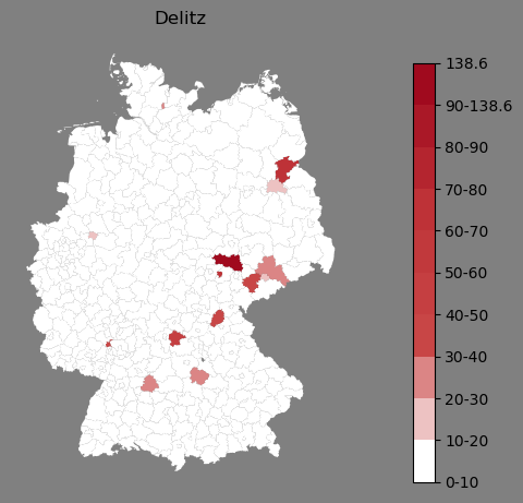 Relative Verteilung des Namens Delitz (1996)Direkt zur Karte Die Farbskala zeigt die Anzahl von "Delitz" bezogen auf je 1 Million Einträge. |