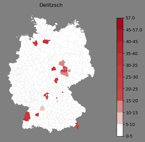 Relative Verteilung des Namens Delitzsch (1996)Direkt zur Karte Die Farbskala zeigt die Anzahl von "Delitzsch" bezogen auf je 1 Million Einträge. |