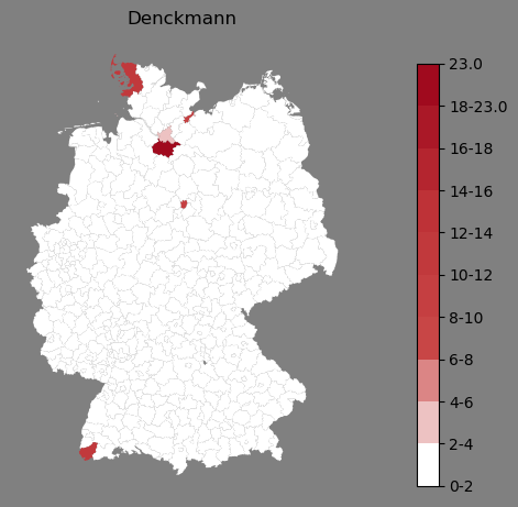 Relative Verteilung des Namens Denckmann (1996)Direkt zur Karte Die Farbskala zeigt die Anzahl von "Denckmann" bezogen auf je 1 Million Einträge. |