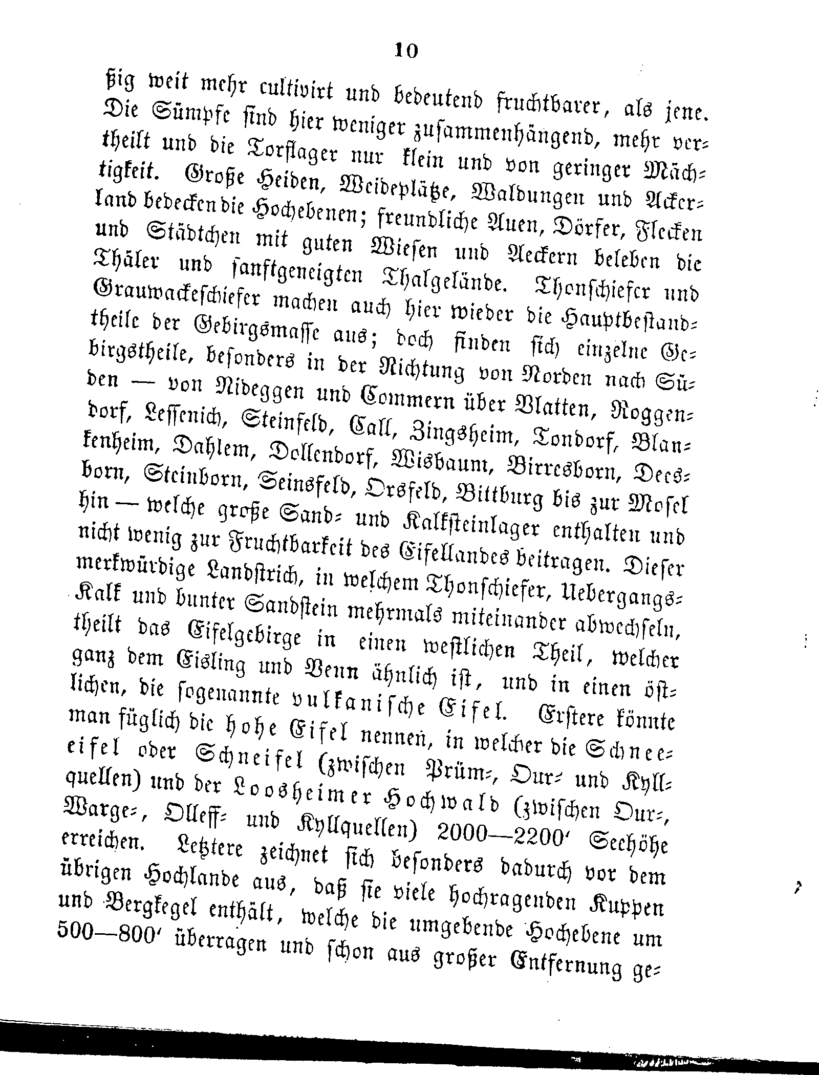 weit mehr cultivirt und bedeutend fruchtbarer, als jene. Die Sümpfe sind hier weniger zusammenhängend, mehr vertheilt und die Torflager nur klein und von geringer Mächtigkeit. Große Heiden, Weideplätze, Waldungen und Ackerland bedecken die Hochebenen; freundliche Auen, Dörfer, Flecken und Städtchen mit guten Wiesen und Aeckern beleben die Thäler und sanftgeneigten Thalgelände. Thonschiefer und Grauwackeschiefer machen auch hier wieder die Hauptbestandtheile der Gebirgsmasse aus; doch finden sich einzelne Gebirgstheile, besonders in der Richtung von Norden nach Süden — von Nideggen und Commern über Vlatten, Roggendorf, Lessenich, Steinfeld, Call, Zingsheim, Tondorf, Blankenheim, Dahlem, Dollendorf, Wisbaum, Birresborn, Deesborn, Steinborn, Seinsfeld, Orsfeld, Bittburg bis zur Mosel hin — welche große Sand- und Kalksteinlager enthalten und nicht wenig zur Fruchtbarkeit des Eifellandes beitragen. Dieser merkwürdige Landstrich, in welchem Thonschiefer, Uebergangs-Kalk und bunter Sandstein mehrmals miteinander abwechseln, theilt das Eifelgebirge in einen westlichen Theil, welcher ganz dem Eisling und Venn ähnlich ist, und in einen östlichen, die sogenannte vulkanische Eifel. Erstere könnte man füglich die hohe Eifel nennen, in welcher die Schneeeifel oder Schneifel (zwischen Prüm-, Our- und Kyllquellen) und der Loosheimer Hochwald (zwischen Our-, Warge-, Olleff- und Kyllquellen) 2000-2200' Seehöhe erreichen. Letztere zeichnet sich besonders dadurch vor dem übrigen Hochlande aus, daß sie viele hochragenden Kuppen und Bergkegel enthält, welche die umgebende Hochebene um 500-800' überragen und schon aus großer Entfernung gesehen