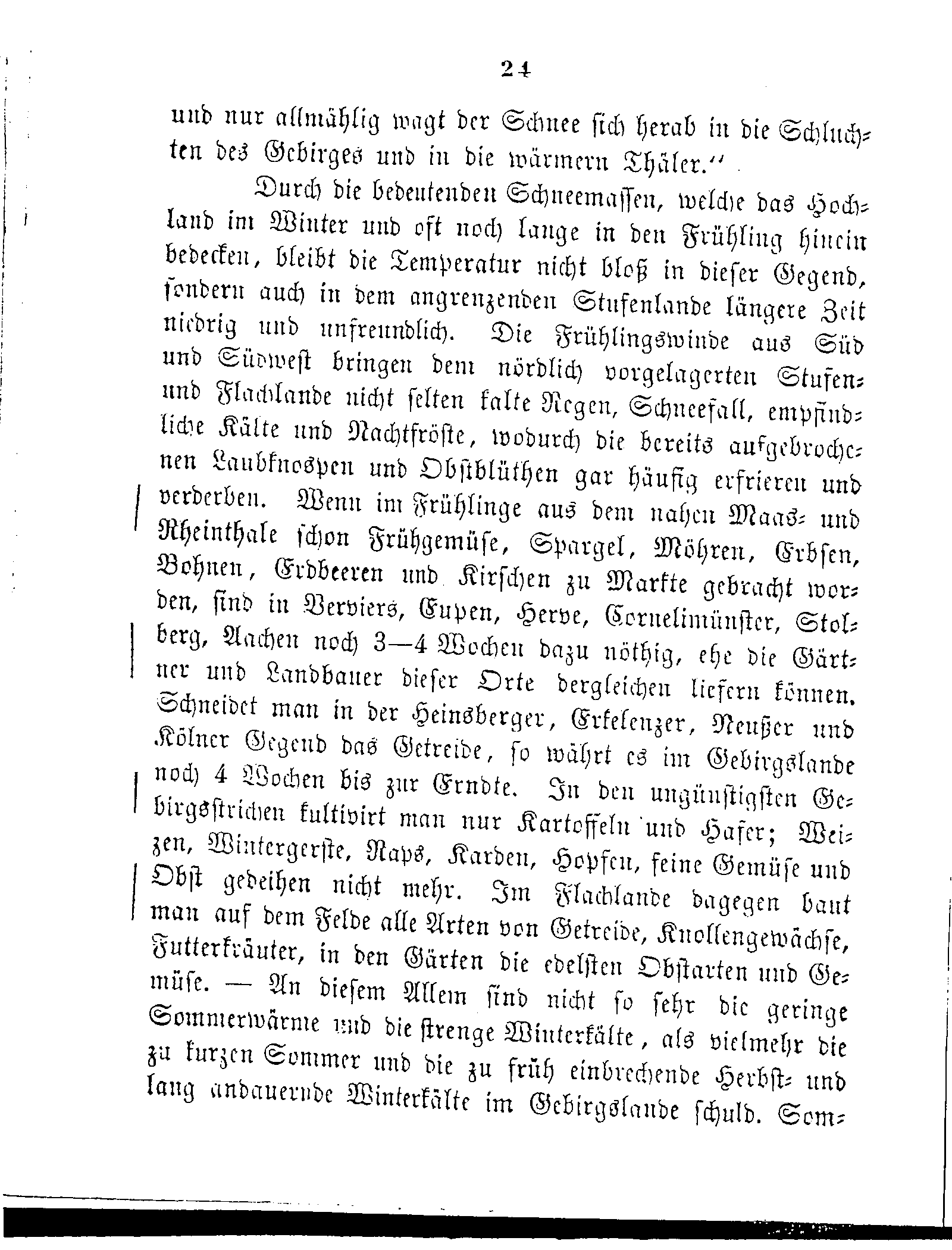 Durch die bedeutenden Schneemassen, welche das Hochland im Winter und oft noch lange in den Frühling hinein bedecken, bleibt die Temperatur nicht bloß in dieser Gegend, sondern auch in dem angrenzenden Stufenlande längere Zeit niedrig und unfreundlich. Die Frühlingswinde aus Süd und Südwest bringen dem nördlich vorgelagerten Stufen- und Flachlande nicht selten kalte Negen, Schneefall, empfindliche Kälte und Nachtfröste, wodurch die bereits aufgebrochenen Laubknospen und Obstblüthen gar häufig erfrieren und verderben. Wenn im Frühlinge aus dem nahen Maas- und Rheinthale schon Frühgemüse, Spargel, Möhren, Erbsen, Bohnen, Erdbeeren und Kirschen zu Markte gebracht werden, sind in Verviers, Eupen, Herve, Cornelimünster, Stolberg, Aachen noch 3-4 Wochen dazu nöthig, ehe die Gärtner und Landbauer dieser Orte dergleichen liefern können. Schneidet man in der Heinsberger, Erkelenzer, Neußer und Kölner Gegend das Getreide, so währt es im Gebirgslande noch 4 Wochen bis zur Erndte. In den ungünstigsten Gebirgsstrichen kultivirt man nur Kartoffeln und Hafer; Weizen, Wintergerste, Raps, Karden, Hopfen, feine Gemüse und Obst gedeihen nicht mehr. Im Flachlande dagegen baut man auf dem Felde alle Arten von Getreide, Knollengewächse, Futterkräuter, in den Gärten die edelsten Obstarten und Gemüse. — An diesem Allem sind nicht so sehr die geringe Sommerwärme und die strenge Winterkälte, als vielmehr die zu kurzen Sommer und die zu früh einbrechende Herbst- und lang andauernde Winterkälte im Gebirgslande schuld. Sommergewächse