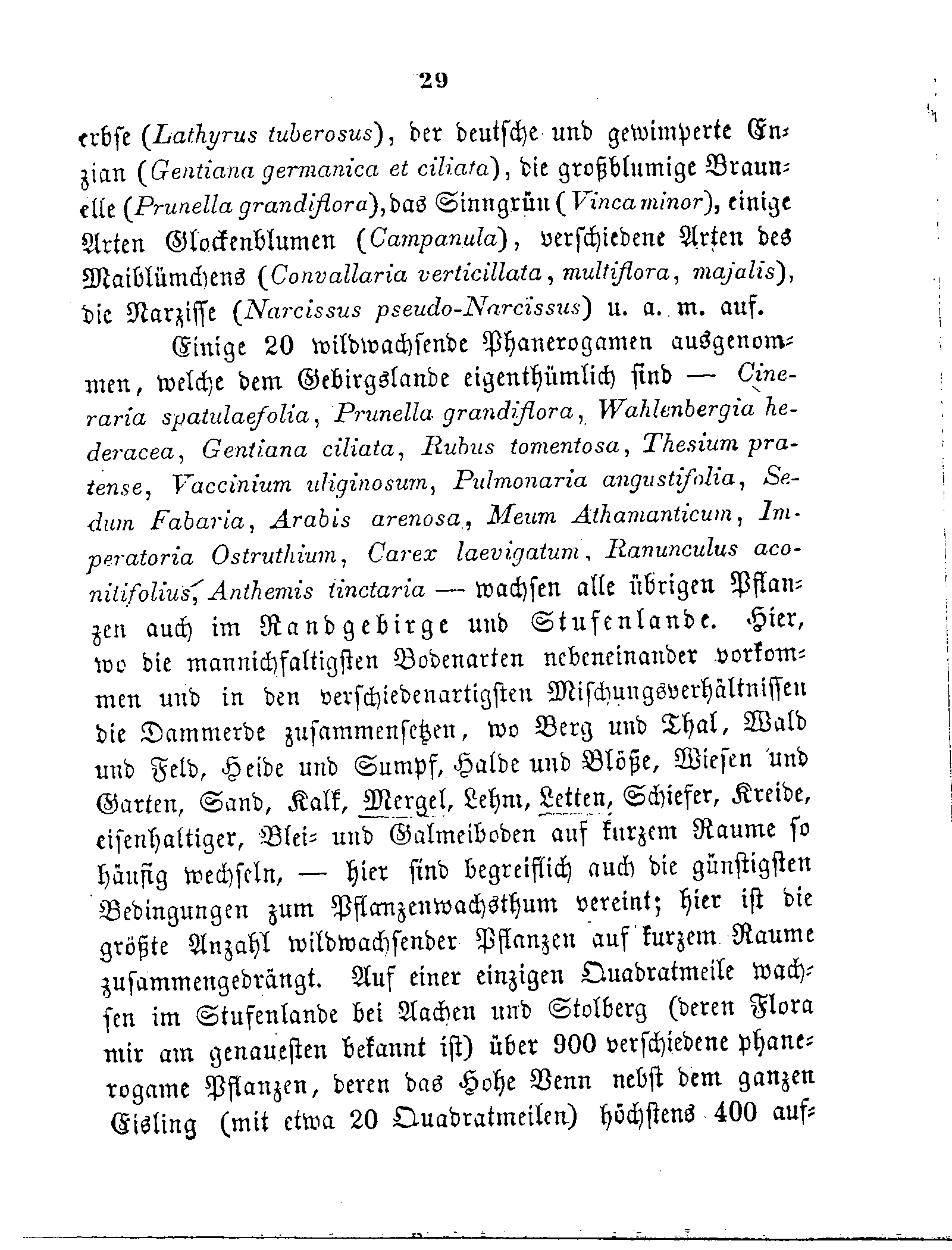 (Lathyrus tuberosus), der deutsche und gewimperte Enzian (Gentiana germanica et ciliata), die großblumige Braunelle (Prunella grandiflora), Sinngrün (Vinca minor), einige Arten Glockenblumen (Campanula), verschiedene Arten des Maiblümchens (Convallaria verticillata, multiflora, majalis), die Narzisse (Narcissus pseudo-Narcissus) u. a.m. auf. Einige 20 wildwachsende Phanerogamen ausgenommen, welche dem Gebirgslande eigenthümlich sind — Cineraria spatulaefolia, Prunella grandiflora, Wahlenbergia hederacea, Gentiana ciliata, Rubus tomentosa, Thesium pratense, Vaccinium uliginosum, Pulmoneria angustifolia, Sedum Fabaria, Arabis arenosa, Meum Athamanticum, Imperatoria Ostruthium, Carex laevigatum, Ranunculus aconitifolius, Anthemis tinctaria — wachsen alle übrigen Pflanzen auch im Randgebirge und Stufenlande. Hier, wo die mannichfaltigsten Bodenarten nebeneinander vorkommen und in den verschiedenartigsten Mischungsverhältnissen die Dammerde zusammensetzen, wo Berg und Thal, Wald und Feld, Heide und Sumpf, Halde und Blöße, Wiesen und Garten, Sand, Kalk, Mergel, Lehm, Letten, Schiefer, Kreide, eisenhaltiger, Blei- und Galmeiboden auf kurzem Räume so häufig wechseln, — hier sind begreiflich auch die günstigsten Bedingungen zum Pflanzenwachsthum vereint; hier ist die größte Anzahl wildwachsender Pflanzen auf kurzem Räume zusammengedrängt. Auf einer einzigen Quadratmeile wachsen im Stufenlande bei Aachen und Stolberg (deren Flora mir am genauesten bekannt ist) über 900 verschiedene phanerogame Pflanzen, deren das Hohe Venn nebst dem ganzen Eisling (mit etwa 20 Quadratmeilen) höchstens 400 aufzuweisen