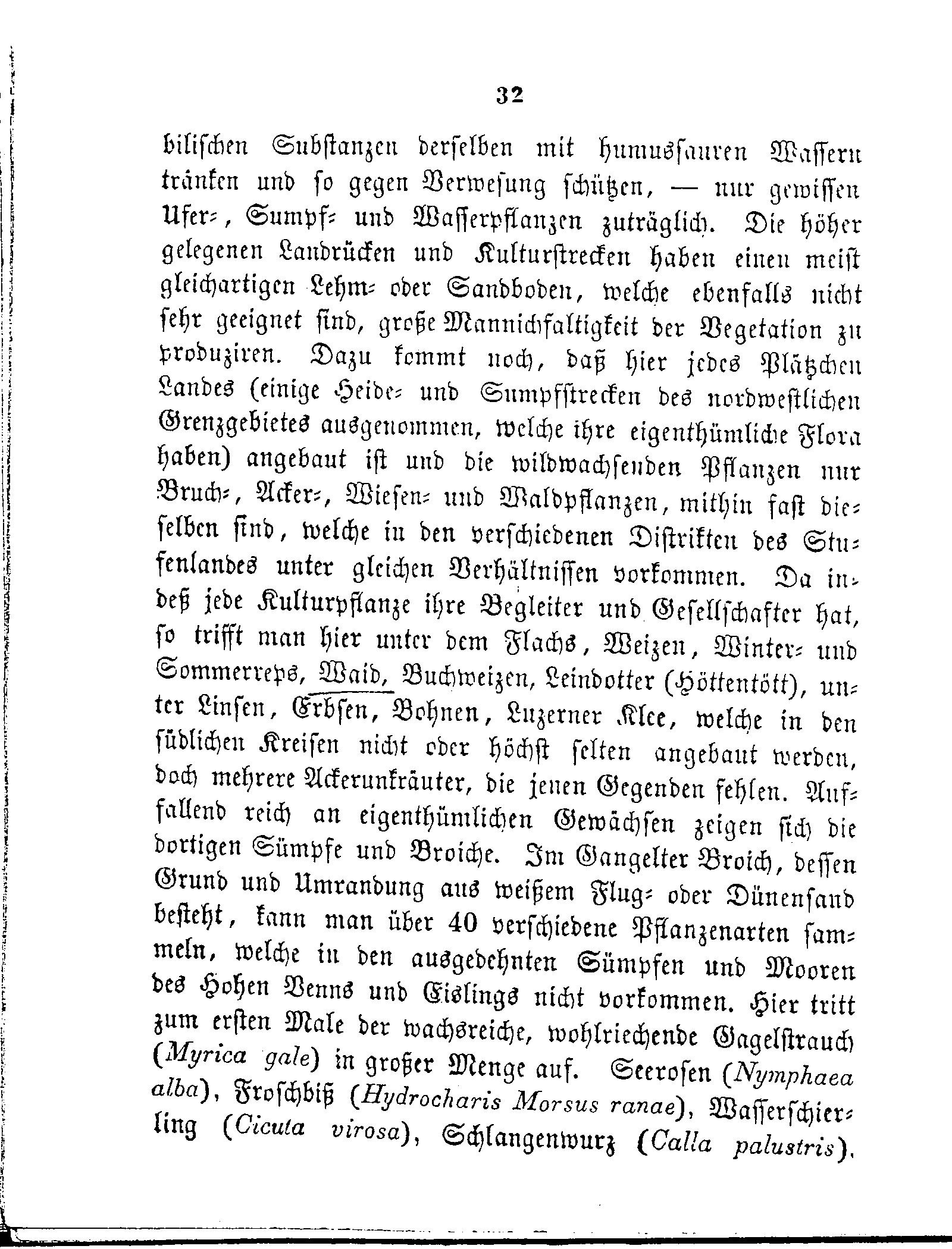 Substanzen derselben mit humussauren Wassern tränken und so gegen Verwesung schützen, — nur gewissen Ufer-, Sumpf- und Wasserpflanzen zuträglich. Die höher gelegenen Landrücken und Kulturstrecken haben einen meist gleichartigen Lehm- oder Sandboden, welche ebenfalls nicht sehr geeignet sind, große Mannichfaltigkeit der Vegetation zu produziren. Dazu kommt noch, daß hier jedes Plätzchen Landes (einige Heide- und Sumpfstrecken des nordwestlichen Grenzgebietes ausgenommen, welche ihre eigenthümliche Flora haben) angebaut ist und die wildwachsenden Pflanzen nur Bruch-, Acker-, Wiesen- und Waldpflanzen, mithin fast dieselben sind, welche in den verschiedenen Distrikten des Stufenlandes unter gleichen Verhältnissen vorkommen. Da indeß jede Kulturpftanze ihre Begleiter und Gesellschafter hat, so trifft man hier unter dem Flachs, Weizen, Winter- und Sommerreps, Waid, Buchweizen, Leindotter (Höttentött), unter Linsen, Erbsen, Bohnen, Luzerner Klee, welche in den südlichen Kreisen nicht oder höchst selten angebaut werden, doch mehrere Ackerunkräuter, die jenen Gegenden fehlen. Auffallend reich an eigenthümlichen Gewächsen zeigen sich die dortigen Sümpfe und Broiche. Im Gangelter Broich, dessen Grund und Umrandung aus weißem Flug- oder Dünensand besteht, kann man über 40 verschiedene Pflanzenarten sammeln, welche in den ausgedehnten Sümpfen und Mooren des Hohen Venns und Eislings nicht vorkommen. Hier tritt zum ersten Male der wachsreiche, wohlriechende Gagelstrauch (Myrica gale) in großer Menge auf. Seerosen (Nymphea alba), Froschbiß (Hydrocharis Morsus ranae), Wasserschierling (Cicuta virosa), Schlangenwurz (Calla palustris).