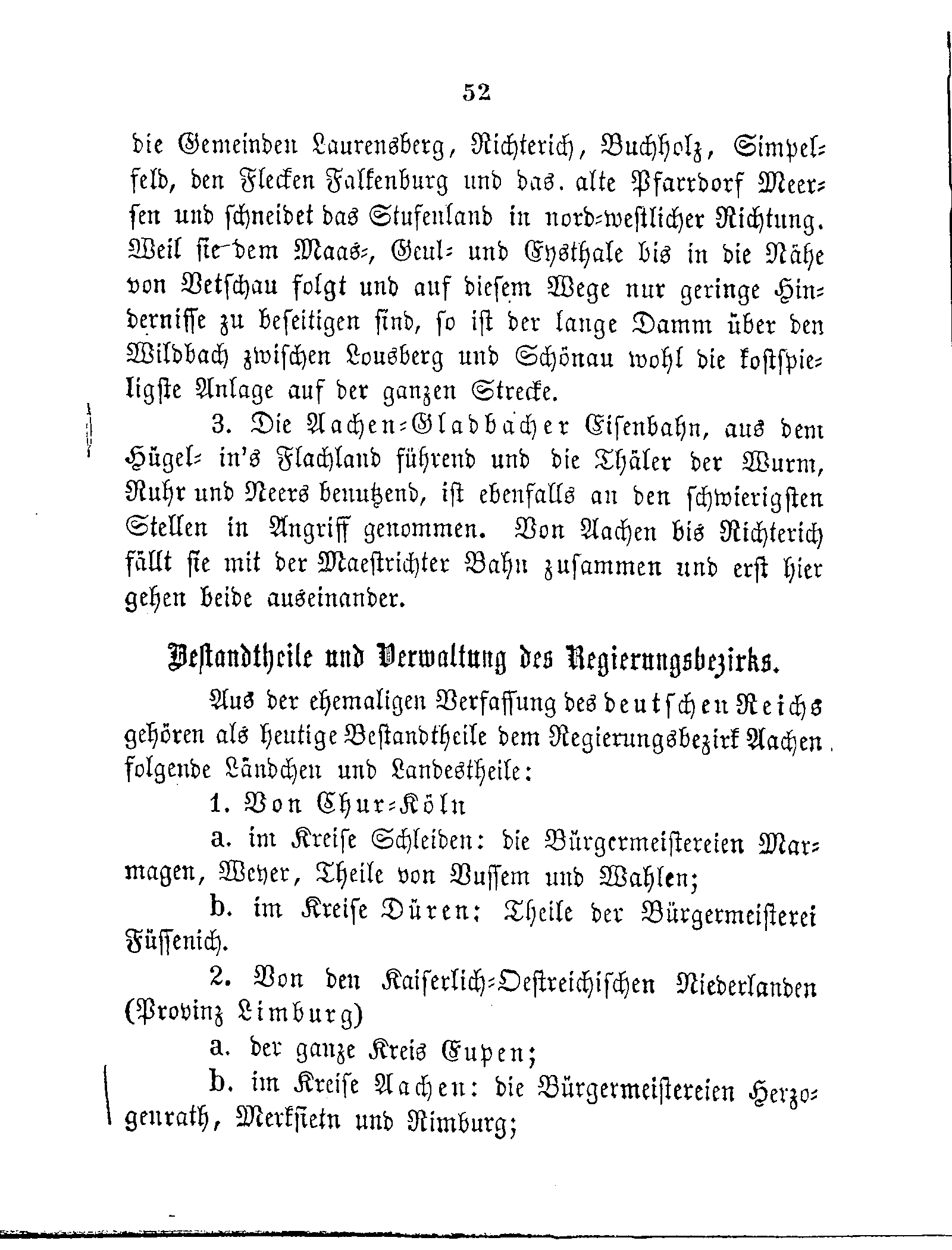 - die Gemeinden Laurensberg, Richterich, Buchholz, Simpelfeld, den Flecken Falkenburg und das alte Pfarrdorf Meersen und schneidet das Stufenland in nord-westlicher Richtung. Weil sie dem Maas-, Geul- und Eysthale bis in die Nähe von Vetschau folgt und auf diesem Wege nur geringe Hindernisse zu beseitigen sind, so ist der lange Damm über den Wildbach zwischen Lousberg und Schönau wohl die kostspieligste Anlage auf der ganzen Strecke.