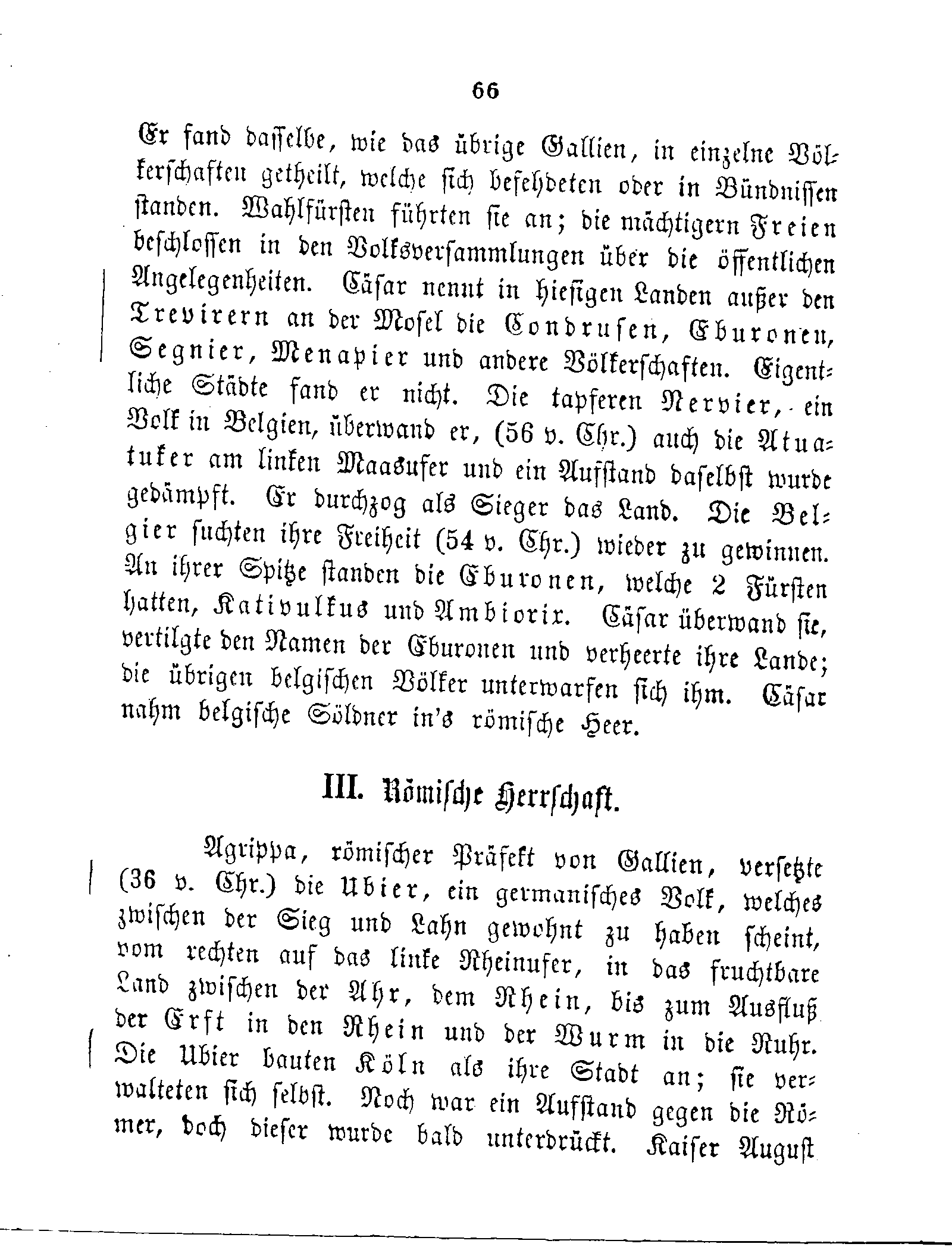 Er fand dasselbe, wie das übrige Gallien, in einzelne Völkerschaften getheitl, welche sich befehdeten oder in Bündnissen standen. Wahlfürsten führten sie an; die mächtigern Freien beschlossen in den Volksversammlungen über die öffentlichen Angelegenheiten. Cäsar nennt in hiesigen Landen außer den Trevirern an der Mosel die Condrusen, Eburonen, Segnier, Menapier und andere Völkerschaften. Eigentliche Städte fand er nicht. Die tapferen Nervier, ein Volk in Belgien, überwand er, (56 v. Chr.) auch die Atuatuker am linken Maasufer und ein Aufstand daselbst wurde gedämpft. Er durchzog als Sieger das Land. Die Belgier suchten ihre Freiheit (54 v. Chr.) wieder zu gewinnen. An ihrer Spitze standen die Eburonen, welche 2 Fürsten hatten, Kativulkus und Ambiorix. Cäsar überwand sie, vertilgte den Namen der Eburonen und verheerte ihre Lande; die übrigen belgischen Völker unterwarfen sich ihm. Cäsar nahm belgische Söldner in's römische Heer.