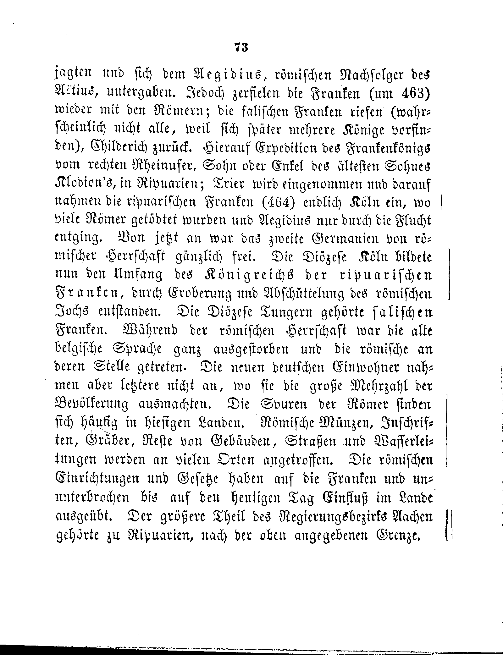 und sich dem Aegidius, römischen Nachfolger des Aëtius, untergaben. Jedoch zerfielen die Franken (um 463) wieder mit den Römern; die salischen Franken riefen (wahrscheinlich nicht alle, weil sich später mehrere Könige vorfinden), Childerich zurück. Hierauf Expedition des Frankenkönigs vom rechten Rheinufer, Sohn oder Enkel des ältesten Sohnes Klodion's, in Ripuarien; Trier wird eingenommen und darauf nahmen die ripuarischen Franken (464) endlich Köln ein, wo viele Römer getödtet wurden und Aegidius nur durch die Flucht entging. Von jetzt an war das zweite Germanien von römischer Herrschaft gänzlich frei. Die Diözese Köln bildete nun den Umfang des Königreichs der ripuarischen Franken, durch Eroberung und Abschüttelung des römischen Jochs entstanden. Die Diözese Tungern gehörte salischen Franken. Während der römischen Herrschaft war die alte belgische Sprache ganz ausgestorben und die römische an deren Stelle getreten. Die neuen deutschen Einwohner nahmen aber letztere nicht an, wo sie die große Mehrzahl der Bevölkerung ausmachten. Die Spuren der Römer finden sich häufig in hiesigen Landen. Römische Münzen, Inschriften, Gräber, Reste von Gebäuden, Straßen und Wasserleitungen werden an vielen Orten angetroffen. Die römischen Einrichtungen und Gesetze haben auf die Franken und ununterbrochen bis auf den heutigen Tag Einfluß im Lande ausgeübt. Der größere Theil des Regierungsbezirks Aachen gehörte zu Ripuarien, nach der oben angegebenen Grenze.