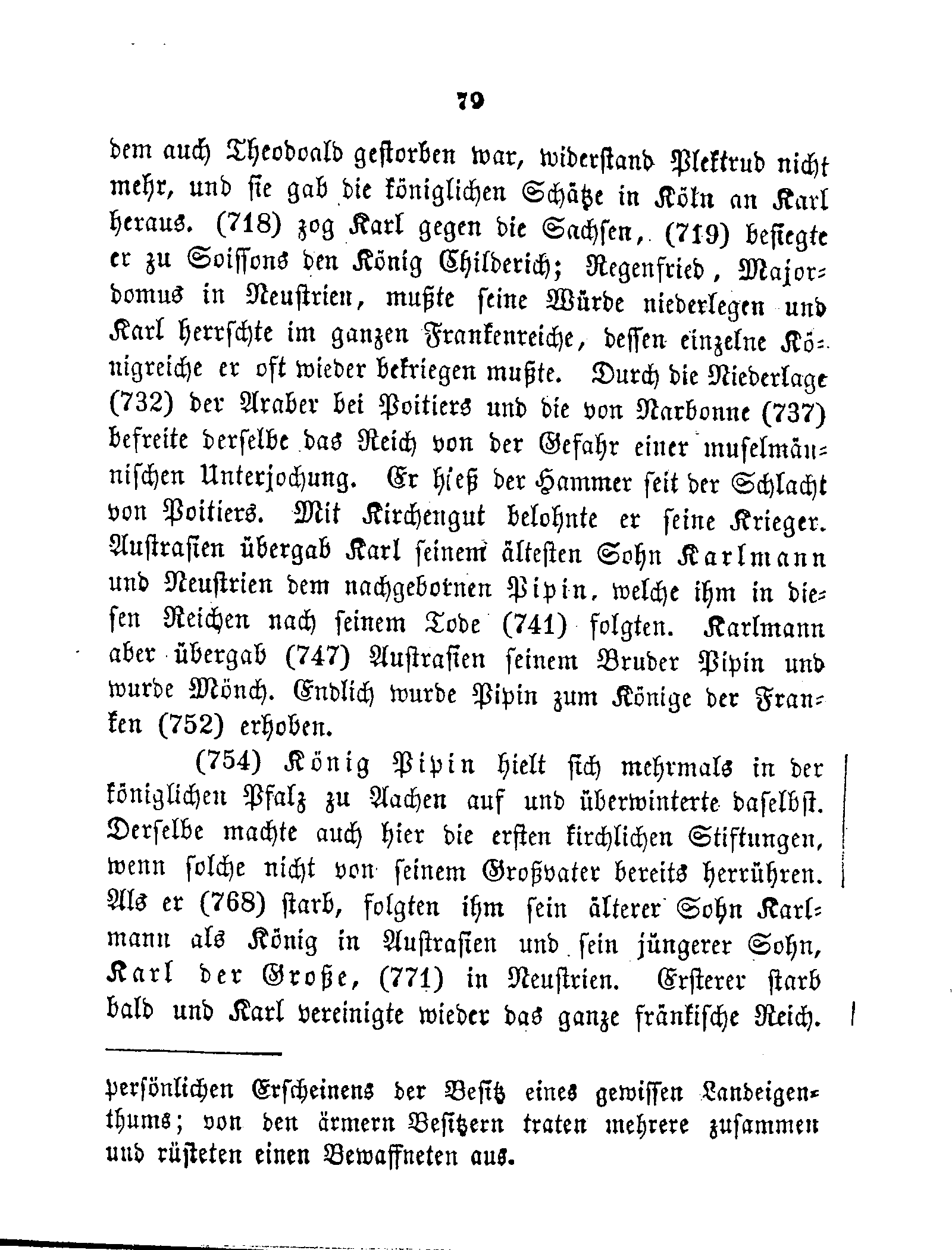 auch Theodoald gestorben war, widerstand Plektrud nicht mehr, und sie gab die königlichen Schätze in Köln an Karl heraus. (718) zog Karl gegen die Sachsen, (719) besiegte er zu Soissons den König Childerich; Regenfried, Majordomus in Neustrien, mußte seine Würde niederlegen und Karl herrschte im ganzen Frankenreiche, dessen einzelne Königreiche er oft wieder bekriegen mußte. Durch die Niederlage (732) der Araber bei Poitiers und die von Narbonne (737) befreite derselbe das Reich von der Gefahr einer muselmännischen Unterjochung. Er hieß der Hammer seit der Schlacht von Poitiers. Mit Kirchengut belohnte er seine Krieger. Austrasien übergab Karl seinem ältesten Sohn Karlmann und Neustrien dem nachgebornen Pipin, welche ihm in diesen Reichen nach seinem Tode (741) folgten. Karlmann aber übergab (747) Australien seinem Bruder Pipin und wurde Mönch. Endlich wurde Pipin zum Könige der Franken (752) erhoben.