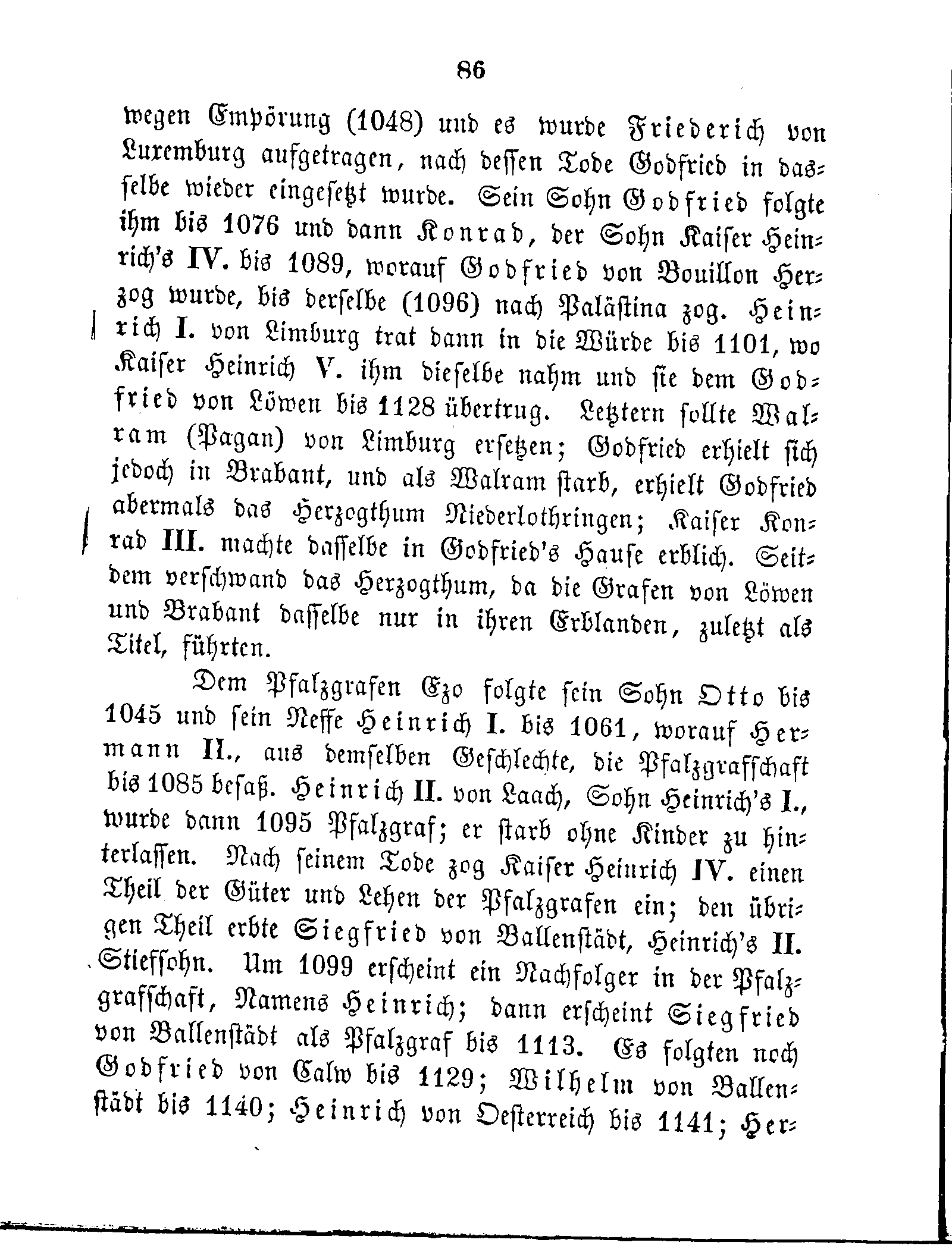 wegen Empörung (1048) und es wurde Friederich von Luxemburg aufgetragen, nach dessen Tode Godfried in dasselbe wieder eingesetzt wurde. Sein Sohn Godfried folgte ihm bis 1076 und dann Konrad, der Sohn Kaiser Heinrich's IV. bis 1089, worauf Godfried von Bouillon Herzog wurde, bis derselbe (1096) nach Palästina zog. Heinrich I. von Limburg trat dann in die Würde bis 1101, wo Kaiser Heinrich V. ihm dieselbe nahm und sie dem Godfried von Löwen bis 1128 übertrug. Letztern sollte Walram (Pagan) von Limburg ersetzen; Godfried erhielt sich jedoch in Brabant, und als Walram starb, erhielt Godfried abermals das Herzogthum Niederlothringen; Kaiser Konrad III. machte dasselbe in Godfried's Hause erblich. Seitdem verschwand das Herzogthum, da die Grafen von Löwen und Brabant dasselbe nur in ihren Erblanden, zuletzt als Titel, führten.