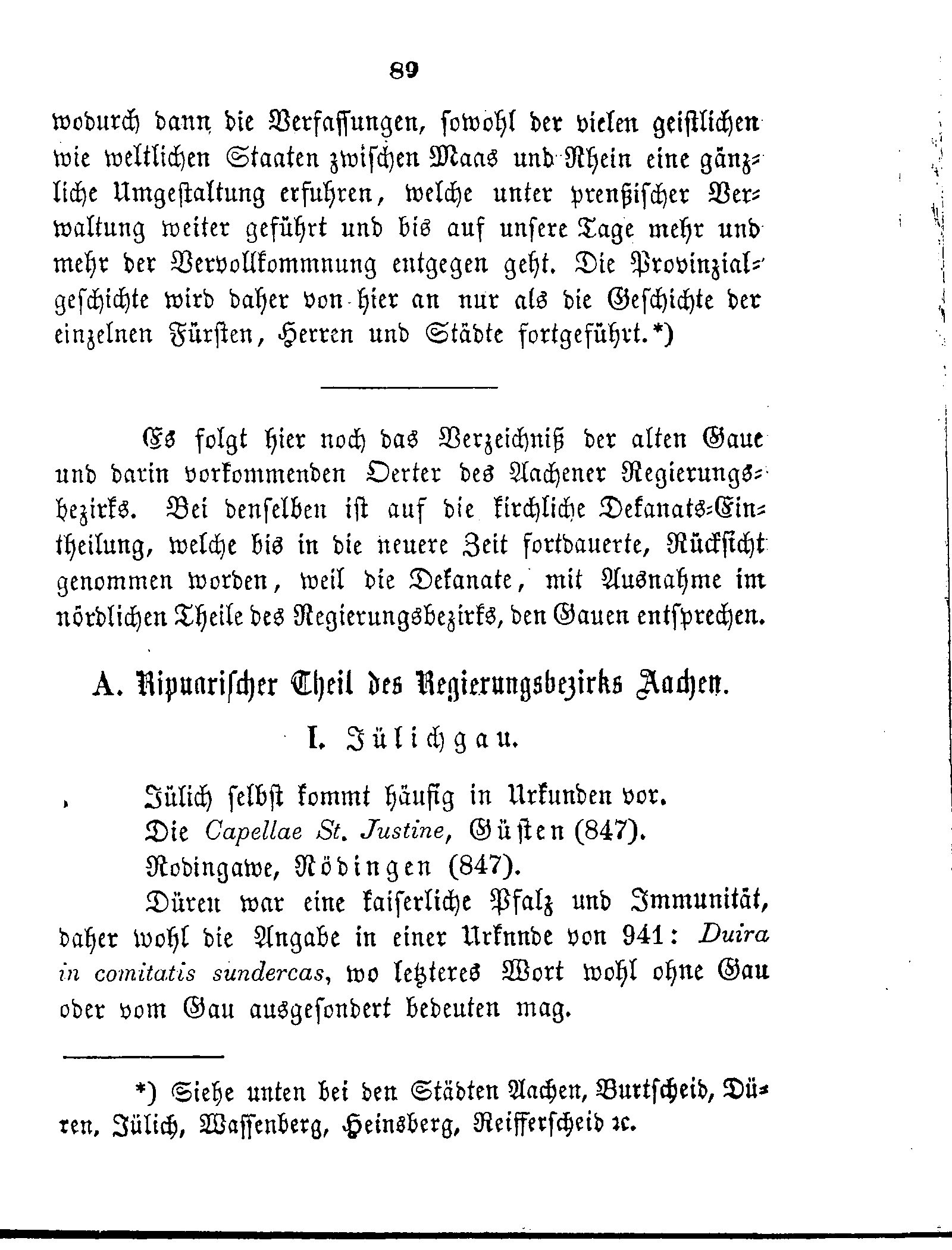 Es folgt hier noch das Verzeichniß der alten Gaue und darin vorkommenden Oerter des Aachener Regierungsbezirks. Bei denselben ist auf die kirchliche Dekanats-Eintheilung, welche bis in die neuere Zeit fortdauerte, Rücksicht genommen worden, weil die Dekanate, mit Ausnahme im nördlichen Theile des Regierungsbezirks, den Gauen entsprechen.