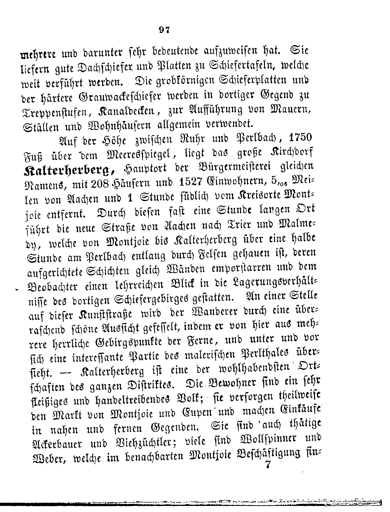 Auf der Höhe zwischen Ruhr und Perlbach, 1750 Fuß über dem Meeresspiegel, liegt das große Kirchdorf Kalterherberg, Hauptort der Bürgermeisterei gleichen Namens, mit 208 Häusern und 1527 Einwohnern, 5,08 Meilen[1] von Aachen und 1 Stunde südlich vom Kreisorte Montjoie entfernt. Durch diesen fast eine Stunde langen Ort führt die neue Straße von Aachen nach Trier und Malmedy, welche von Montjoie bis Kalterherberg über eine halbe Stunde am Perlbach entlang durch Felsen gehauen ist, deren aufgerichtete Schichten gleich Wänden emporstarren und dem Beobachter einen lehrreichen Blick in die Lagerungsverhaltnisse des dortigen Schiefergebirges gestatten. An einer Stelle auf dieser Kunststraße wird der Wanderer durch eine überraschend schöne Aussicht gefesselt, indem er von hier aus mehrere herrliche Gebirgspunkte der Ferne, und unter und vor sich eine interessante Partie des malerischen Perlthales übersieht. — Kalterherberg ist eine der wohlhabendsten Ortschaften des ganzen Distriktes. Die Bewohner sind ein sehr fleißiges und handeltreibendes Volk; sie versorgen theilweise den Markt von Montjoie und Eupen und machen Einkäufe in nahen und fernen Gegenden. Sie sind auch thätige Ackerbauer und Viehzüchtler; viele sind Wollspinner und Weber, welche im benachbarten Montjoie Beschäftigung finden;