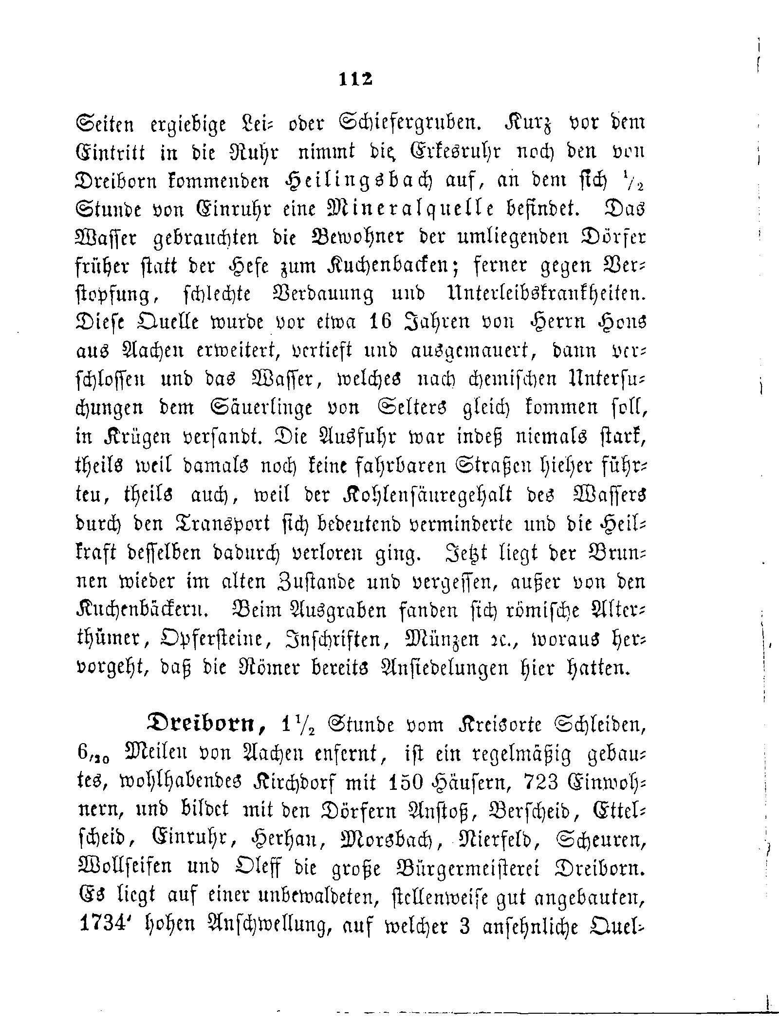 Seiten ergiebige Lei- oder Schiefergruben. Kurz vor dem Eintritt in die Ruhr nimmt die Erkesruhr noch den von Dreiborn kommenden Heilingsbach auf, an dem sich ½ Stunde von Einruhr eine Mineralquelle befindet. Das Wasser gebrauchten die Bewohner der umliegenden Dörfer früher statt der Hefe zum Kuchenbacken; ferner gegen Verstopfung, schlechte Verdauung und Unterleibskrankheiten. Diese Quelle wurde vor etwa 16 Jahren von Herrn Hons aus Aachen erweitert, vertieft und ausgemauert, dann verschlossen und das Wasser, welches nach chemischen Untersuchungen dem Säuerlinge von Selters gleich kommen soll, in Krügen versandt. Die Ausfuhr war indeß niemals stark, theils weil damals noch keine fahrbaren Straßen hieher führten, theils auch, weil der Kohlensäuregehalt des Wassers durch den Transport sich bedeutend verminderte und die Heilkraft desselben dadurch verloren ging. Jetzt liegt der Brunnen wieder im alten Zustande und vergessen, außer von den Kuchenbäckern. Beim Ausgraben fanden sich römische Alterthümer, Opfersteine, Inschriften, Münzen ec., woraus hervorgeht, daß die Römer bereits Ansiedelungen hier hatten.