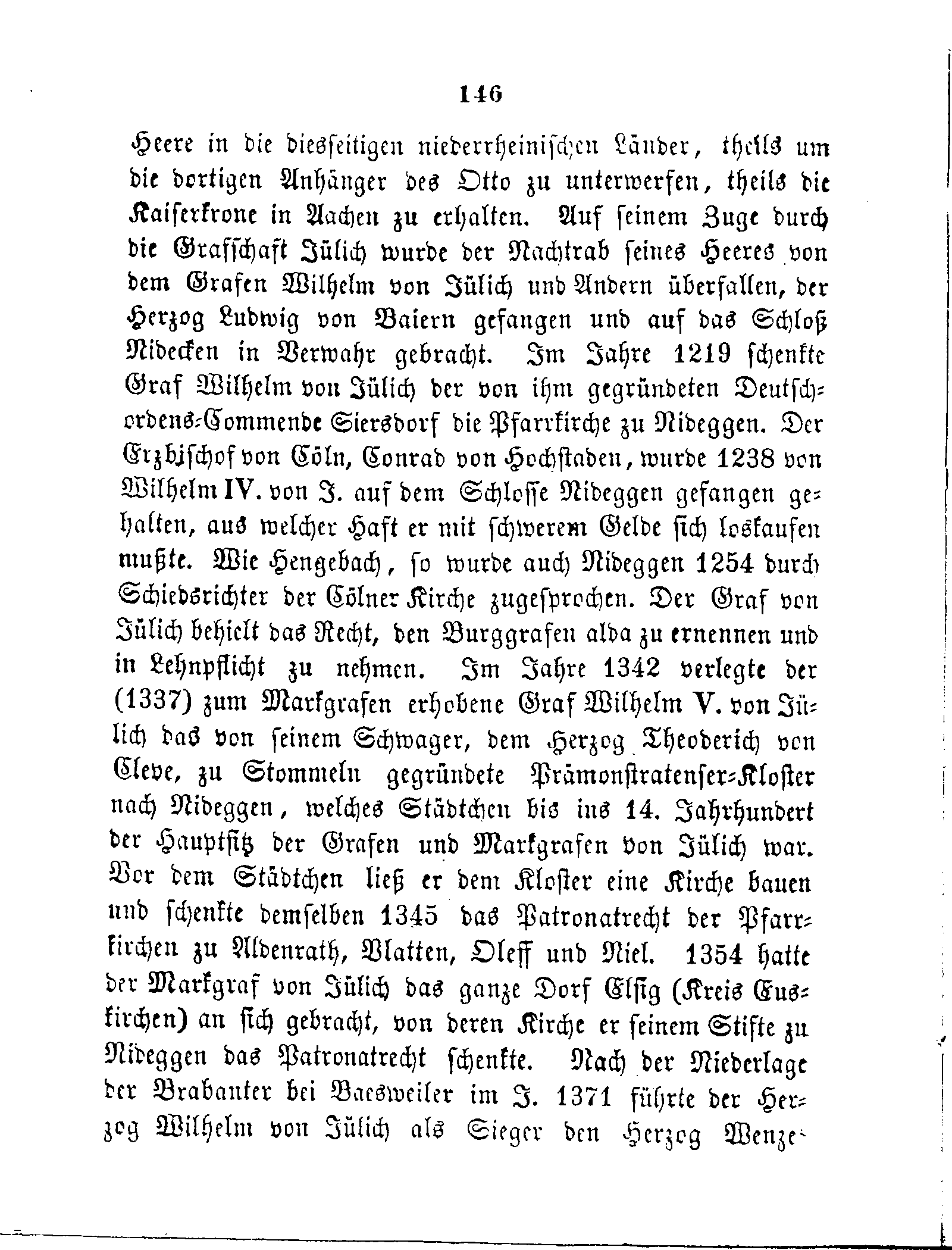 Heere in die diesseitigen niederrheinischen Länder, theils um die dortigen Anhänger des Otto zu unterwerfen, theils die Kaiserkrone in Aachen zu erhalten. Auf seinem Zuge durch die Grafschaft Jülich wurde der Nachtrab seines Heeres von dem Grafen Wilhelm von Jülich und Andern überfallen, der Herzog Ludwig von Baiern gefangen und auf das Schloß Nideggen in Verwahr gebracht. Im Jahre 1219 schenkte Graf Wilhelm von Jülich der von ihm gegründeten Deutschordens-Commende Siersdorf die Pfarrkirche zu Nideggen. Der Erzbischof von Cöln, Conrad von Hochstaden, wurde 1238 von Wilhelm IV. von J. auf dem Schlosse Nideggen gefangen gehalten, aus welcher Haft er mit schwerem Gelde sich loskaufen mußte. Wie Hengebach, so wurde auch Nideggen 1254 durch Schiedsrichter der Cölner Kirche zugesprochen. Der Graf von Jülich behielt das Recht, den Burggrafen alda zu ernennen und in Lehnpflicht zu nehmen. Im Jahre 1342 verlegte der (1337) zum Markgrafen erhobene Graf Wilhelm V. von Jülich das von seinem Schwager, dem Herzog Theoderich von Cleve, zu Stommeln gegründete Prämonstratenser-Kloster nach Nideggen, welches Städtchen bis ins 14. Jahrhundert der Hauptsitz der Grafen und Markgrafen von Jülich war. Vor dem Städtchen ließ er dem Kloster eine Kirche bauen und schenkte demselben 1345 das Patronatrecht der Pfarrkirchen zu Aldenrath, Blatten, Oleff und Niel. 1354 hatte der Markgraf von Jülich das ganze Dorf Elsig (Kreis Euskirchen) an sich gebracht, von deren Kirche er seinem Stifte zu Nideggen das Patronatrecht schenkte. Nach der Niederlage der Brabanter bei Baesweiler im J. 1371 führte der Herzog Wilhelm von Jülich als Sieger den Herzog Wenzel