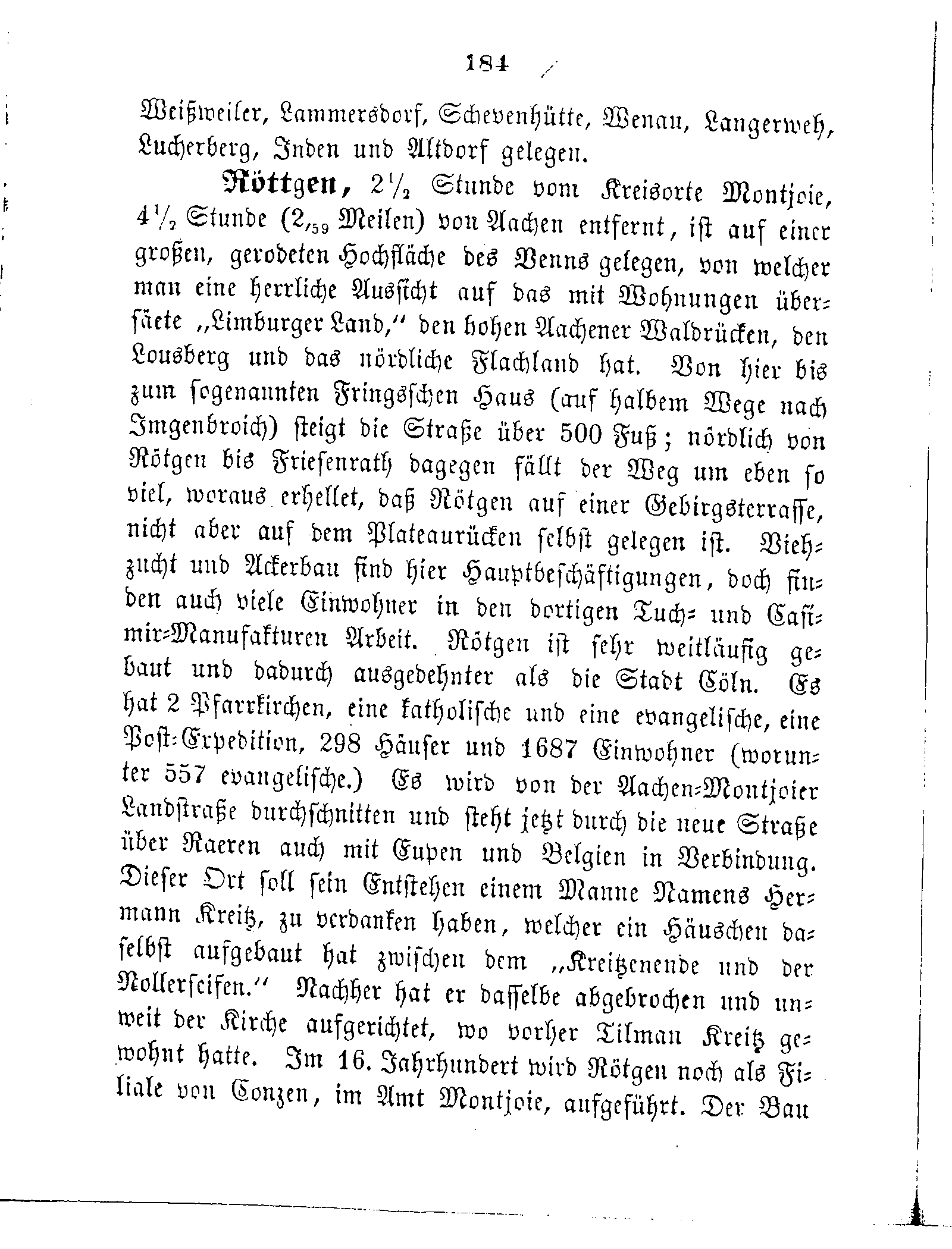 Röttgen, 2½ Stunde vom Kreisorte Montjoie, 4½ Stunde (2,59 Meilen) von Aachen entfernt, ist auf einer großen, gerodeten Hochfläche des Venns gelegen, von welcher man eine herrliche Aussicht auf das mit Wohnungen übersäete „Limburger Land,“ den hohen Aachener Waldrücken, den Lousberg und das nördliche Flachland hat. Von hier bis zum sogenannten Fringsschen Haus (auf halbem Wege nach Imgenbroich) steigt die Straße über 500 Fuß; nördlich von Rötgen bis Friesenrath dagegen fällt der Weg um eben so viel, woraus erhellet, daß Rötgen auf einer Gebirgsterrasse, nicht aber auf dem Plateaurücken selbst gelegen ist. Viehzucht uud Ackerbau sind hier Hauptbeschäftigungen, doch finden auch viele Einwohner in den dortigen Tuch- und Casimir-Manufakturen Arbeit. Rötgen ist sehr weitläufig gebaut und dadurch ausgedehnter als die Stadt Cöln. Es hat 2 Pfarrkirchen, eine katholische und eine evangelische, eine Post-Expedition, 298 Häuser und 1687 Einwohner (worunter 557 evangelische.) Es wird von der Aachen-Montjoier Landstraße durchschnitten und steht jetzt durch die neue Straße über Raeren auch mit Eupen und Belgien in Verbindung. Dieser Ort soll sein Entstehen einem Manne Namens Hermann Kreitz, zu verdanken haben, welcher ein Häuschen daselbst aufgebaut hat zwischen dem „Kreitzenende und der Nollerseifen.“ Nachher hat er dasselbe abgebrochen und unweit der Kirche aufgerichtet, wo vorher Tilman Kreitz gewohnt hatte. Im 16. Jahrhundert wird Rötgen noch als Filiale von Conzen, im Amt Montjoie, aufgeführt. Der Bau
