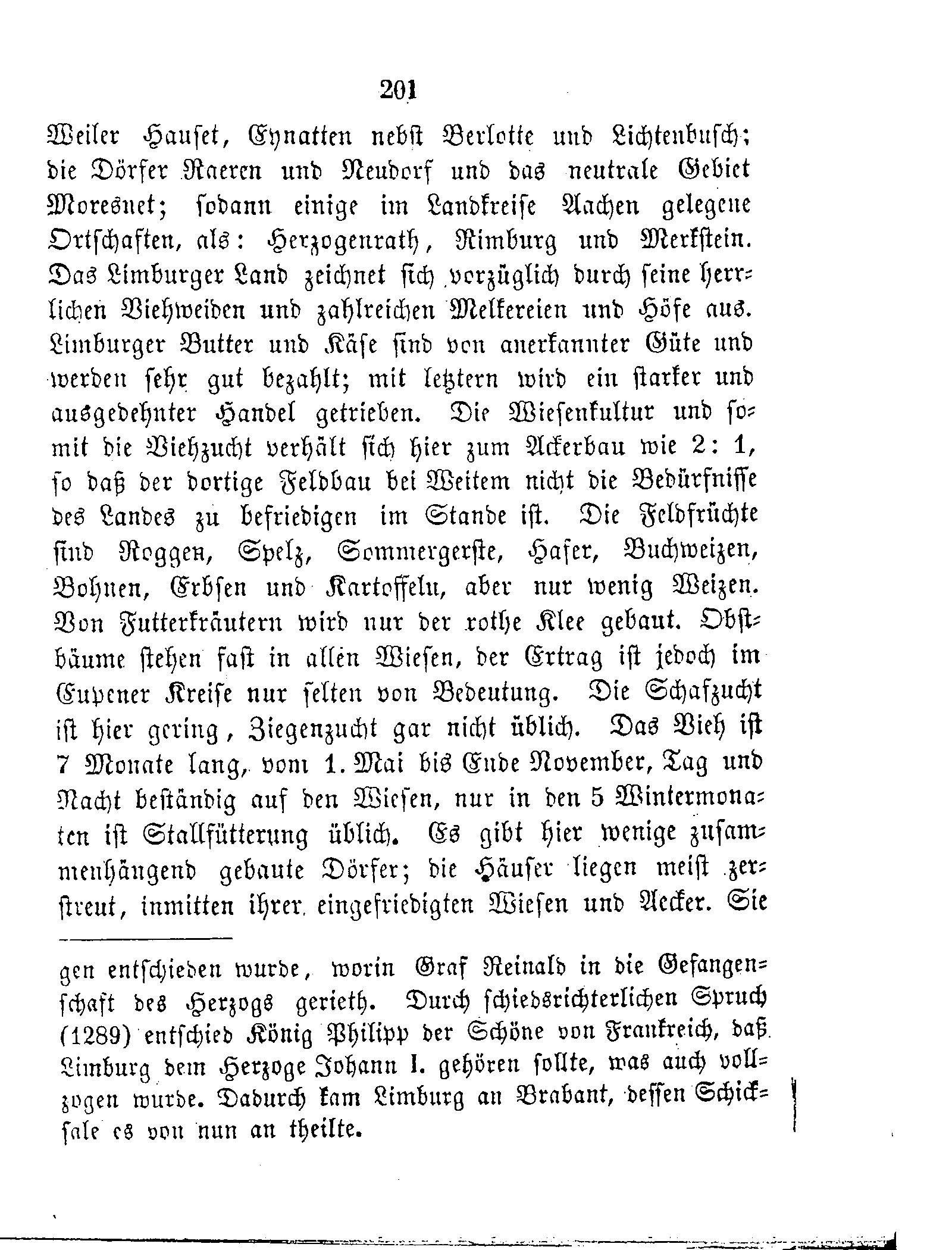 Weiler Hauset, Eynatten nebst Berlotte und Lichtenbusch: die Dörfer Raeren und Neudorf und das neutrale Gebiet Moresnet; sodann einige im Landkreise Aachen gelegene Ortschaften, als: Herzogenrath, Rimburg und Merkstein. Das Limburger Land zeichnet sich vorzüglich durch seine herrlichen Viehweiden und zahlreichen Melkereien und Höfe aus. Limburger Butter und Käse sind von anerkannter Güte und werden sehr gut bezahlt; mit letztern wird ein starker und ausgedehnter Handel getrieben. Die Wiesenkultur und somit die Viehzucht verhält sich hier zum Ackerbau wie 2:1, so daß der dortige Feldbau bei Weitem nicht die Bedürfnisse des Landes zu befriedigen im Stande ist. Die Feldfrüchte sind Roggen, Spelz[1], Sommergerste, Hafer, Buchweizen, Bohnen, Erbsen und Kartoffeln, aber nur wenig Weizen. Von Futterkräutern wird nur der rothe Klee gebaut. Obstbäume stehen fast in allen Wiesen, der Ertrag ist jedoch im Eupener Kreise nur selten von Bedeutung. Die Schafzucht ist hier gering, Ziegenzucht gar nicht üblich. Das Vieh ist 7 Monate lang, vom 1. Mai bis Ende November, Tag und Nacht beständig auf den Wiesen, nur in den 5 Wintermonaten ist Stallfütterung üblich. Es gibt hier wenige zusammenhängend gebaute Dörfer; die Häuser liegen meist zerstreut, inmitten ihrer eingefriedigten Wiesen und Aecker. Sie