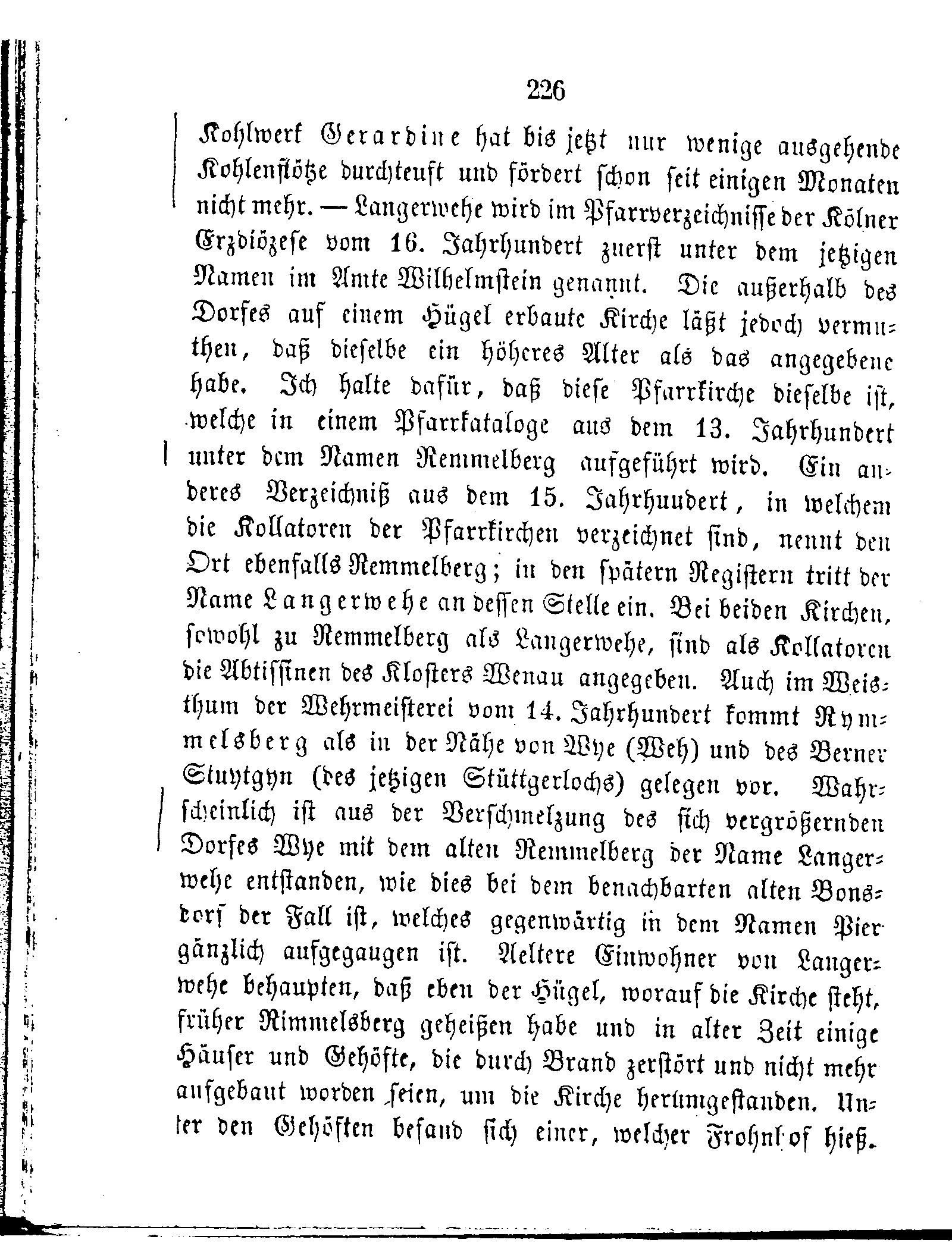 Kohlwerk Gerardine hat bis jetzt nur wenige ausgehende Kohlenflötze durchteuft und fördert schon seit einigen Monaten nicht mehr. — Langerwehe wird im Pfarrverzeichnisse der Kölner Erzdiözese vom 16. Jahrhundert zuerst unter dem jetzigen Namen im Amte Wilhelmstein genannt. Die außerhalb des Dorfes auf einem Hügel erbaute Kirche läßt jedoch vermuthen, daß dieselbe ein höheres Alter als das angegebene habe. Ich halte dafür, daß diese Pfarrkirche dieselbe ist, welche in einem Pfarrkataloge aus dem 13. Jahrhundert unter dem Namen Remmelberg aufgeführt wird. Ein anderes Verzeichniß aus dem 15. Jahrhundert, in welchem die Kollatoren der Pfarrkirchen verzeichnet sind, nennt den Ort ebenfalls Remmelberg; in den spätern Registern tritt der Name Langerwehe an dessen Stelle ein. Bei beiden Kirchen, sowohl zu Remmelberg als Langerwehe, sind als Kollatoren die Abtissinen des Klosters Wenau angegeben. Auch im Weisthum der Wehrmeisterei vom 14. Jahrhundert kommt Rymmelsberg als in der Nähe von Wye (Weh) und des Berner Stuytgyn (des jetzigen Stüttgerlochs) gelegen vor. Wahrscheinlich ist aus der Verschmelzung des sich vergrößernden Dorfes Wye mit dem alten Remmelberg der Name Langerwehe entstanden, wie dies bei dem benachbarten alten Bonsdorf der Fall ist, welches gegenwärtig in dem Namen Pier gänzlich aufgegangen ist. Aeltere Einwohner von Langerwehe behaupten, daß eben der Hügel, worauf die Kirche steht, früher Rimmelsberg geheißen habe und in alter Zeit einige Häuser und Gehöfte, die durch Brand zerstört und nicht mehr ausgebaut worden seien, um die Kirche herumgestanden. Unter den Gehöften befand sich einer, welcher Frohnhof hieß.