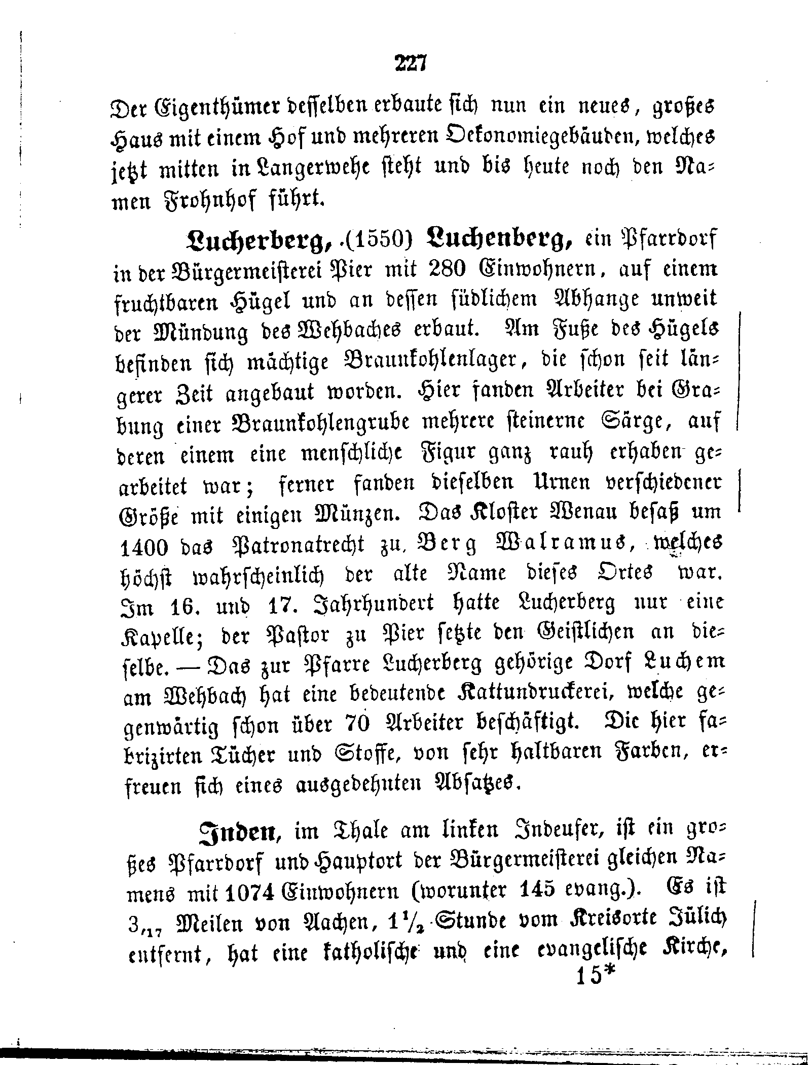 Lucherberg, (1550) Luchenberg, ein Pfarrdorf in der Bürgermeisterei Pier mit 280 Einwohnern auf einem fruchtbaren Hügel und an dessen südlichem Abhange unweit der Mündung des Wehbaches erbaut. Am Fuße des Hügels befinden sich mächtige Braunkohlenlager, die schon seit längerer Zeit angebaut worden. Hier fanden Arbeiter bei Grabung einer Braunkohlengrube mehrere steinerne Särge, auf deren einem eine menschliche Figur ganz rauh erhaben gearbeitet war; ferner fanden dieselben Urnen verschiedener Größe mit einigen Münzen. Das Kloster Wenau besaß um 1400 das Patronatrecht zu Berg Walramus, welches höchst wahrscheinlich der alte Name dieses Ortes war. Im 16. und 17. Jahrhundert hatte Lucherberg nur eine Kapelle; der Pastor zu Pier setzte den Geistlichen an dieselbe. — Das zur Pfarre Lucherberg gehörige Dorf Luchem am Wehbach hat eine bedeutende Kattundruckerei, welche gegenwärtig schon über 70 Arbeiter beschäftigt. Die hier fabrizirten Tücher und Stoffe, von sehr haltbaren Farben, erfreuen sich eines ausgedehnten Absatzes.