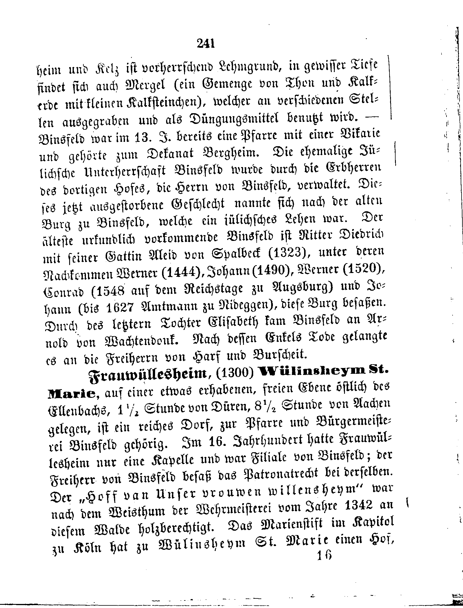 und Kelz ist vorherrschend Lehmgrund, in gewisser Tiefe findet sich auch Mergel (ein Gemenge von Thon und Kalkerde mit kleinen Kalksteinchen), welcher an verschiedenen Stellen ausgegraben und als Düngungsmittel benutzt wird. — Binsfeld war im 13. J. bereits eine Pfarre mit einer Vikarie und gehörte zum Dekanat Bergheim. Die ehemalige Jülichsche Unterherrschaft Binsfeld wurde durch die Erbherren des dortigen Hofes, die Herrn von Binsfeld, verwaltet. Dieses jetzt ausgestorbene Geschlecht nannte sich nach der alten Burg zu Binsfeld, welche ein jülichsches Lehen war. Der älteste urkundlich vorkommende Binsfeld ist Ritter Diedrich mit seiner Gattin Aleid von Spalbeck (1323), unter deren Nachkommen Werner (1444), Johann (1490), Werner (1520), Conrad (1548 auf dem Reichstage zu Augsburg) und Johann (bis 1627 Amtmann zu Nideggen), diese Burg besaßen. Durch des letztern Tochter Elisabeth kam Binsfeld an Arnold von Wachtendonk. Nach dessen Enkels Tode gelangte es an die Freiherrn von Harf und Burscheit.