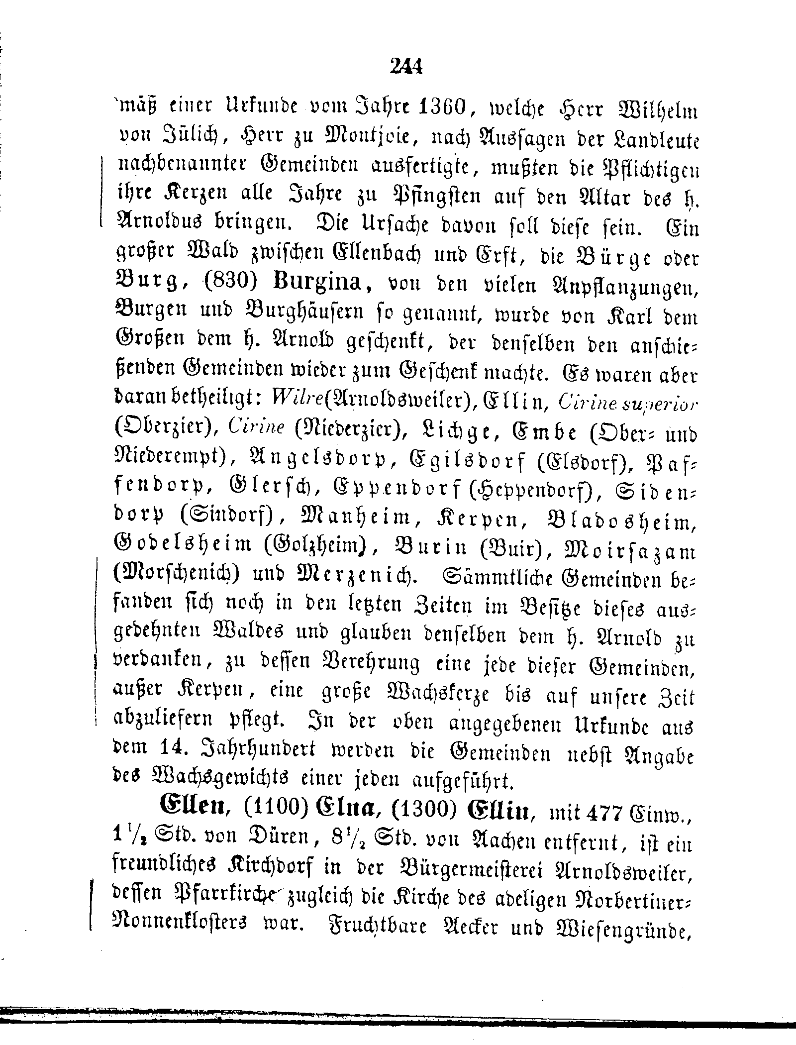 einer Urkunde vom Jahre 1360, welche Herr Wilhelm von Jülich, Herr zu Montjoie, nach Aussagen der Landleute nachbenannter Gemeinden ausfertigte, mußten die Pflichtigen ihre Kerzen alle Jahre zu Pfingsten auf den Altar des h. Arnoldus bringen. Die Ursache davon soll diese sein. Ein großer Wald zwischen Ellenbach und Erft, die Bürge oder Burg, (830) Burgina, von den vielen Anpflanzungen, Burgen und Burghäusern so genannt, wurde von Karl dem Großen dem h. Arnold geschenkt, der denselben den anschießenden Gemeinden wieder zum Geschenk machte. Es waren aber daran betheillgt: Wilre (Arnoldsweiler), Ellin, Cirine superior (Oberzier), Cirine (Niederzier), Lichge, Embe (Ober- und Niederempt), Angelsdorp, Egilsdorf (Elsdorf), Paffendorp, Glersch, Eppendorf (Heppendorf), Sidendorp (Sindorf), Manheim, Kerpen, Bladosheim, Godelsheim (Golzheim), Burin (Buir), Moirsazam (Morschenich) und Merzenich. Sammtliche Gemeinden befanden sich noch in den letzten Zeiten im Besitze dieses ausgedehnten Waldes und glauben denselben dem h. Arnold zu verdanken, zu dessen Verehrung eine jede dieser Gemeinden, außer Kerpen, eine große Wachskerze bis auf unsere Zeit abzuliefern pflegt. In der oben angegebenen Urkunde aus dem 14. Jahrhundert werden die Gemeinden nebst Angabe des Wachsgewichts einer jeden aufgeführt.