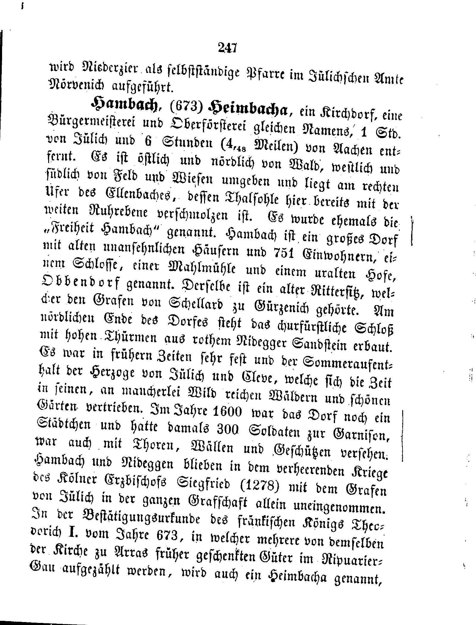 Hambach, (673) Heimbacha, ein Kirchdorf, eine Bürgermeisterei und Oberförsterei gleichen Namens, 1 Std. von Jülich und 6 Stunden (4,48 Meilen) von Aachen entfernt. Es ist östlich und nördlich von Wald, westlich und südlich von Feld und Wiesen umgeben und liegt am rechten Ufer des Ellenbaches, dessen Thalsohle hier bereits mit der weiten Ruhrebene verschmolzen ist. Es wurde ehemals die „Freiheit Hambach“ genannt. Hambach ist ein großes Dorf mit alten unansehnlichen Häusern und 751 Einwohnern, einem Schlosse, einer Mahlmühle und einem uralten Hofe, Obbendorf genannt. Derselbe ist ein alter Rittersitz, welcher den Grafen von Schellard zu Gürzenich gehörte. Am nördlichen Ende des Dorfes steht das churfürstliche Schloß mit hohen Thürmen aus rothem Nidegger Sandstein erbaut. Es war in frühern Zeiten sehr fest und der Sommeraufenthalt der Herzoge von Jülich und Cleve, welche sich die Zeit in seinen, an mancherlei Wild reichen Wäldern und schönen Gärten vertrieben. Im Jahre 1600 war das Dorf noch ein Städtchen und hatte damals 300 Soldaten zur Garnison, war auch mit Thoren, Wällen und Geschützen versehen. Hambach und Nideggen blieben in dem verheerenden Kriege des Kölner Erzbischofs Siegfried (1278) mit dem Grafen von Jülich in der ganzen Grafschaft allein uneingenommen. In der Bestätigungsurkunde des fränkischen Königs Theodorich I. vom Jahre 673, in welcher mehrere von demselben der Kirche zu Arras früher geschenkten Güter im Ripuarier-Gau aufgezählt werden, wird auch ein Heimbacha genannt,