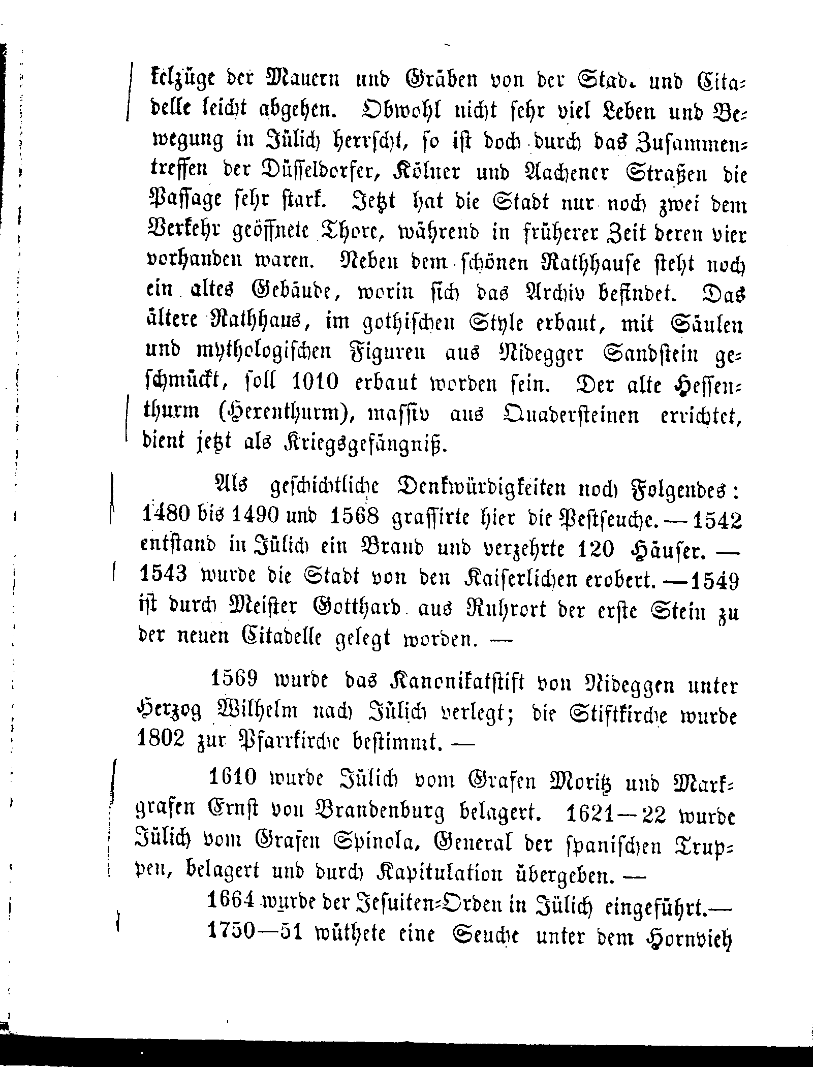 der Mauern und Gräben von der Stadt und Citadelle leicht abgehen. Obwohl nicht sehr viel Leben und Bewegung in Jülich herrscht, so ist doch durch das Zusammentreffen der Düsseldorfer, Kölner und Aachener Straßen die Passage sehr stark. Jetzt hat die Stadt nur noch zwei dem Verkehr geöffnete Thore, während in früherer Zeit deren vier vorhanden waren. Neben dem schönen Rathhause steht noch ein altes Gebäude, worin sich das Archiv befindet. Das ältere Rathhaus, im gothischen Style erbaut, mit Säulen und mythologischen Figuren aus Nidegger Sandstein geschmückt, soll 1010 erbaut worden sein. Der alte Hessenthurm (Hexenthurm), massiv aus Quadersteinen errichtet, dient jetzt als Kriegsgefängniß.
